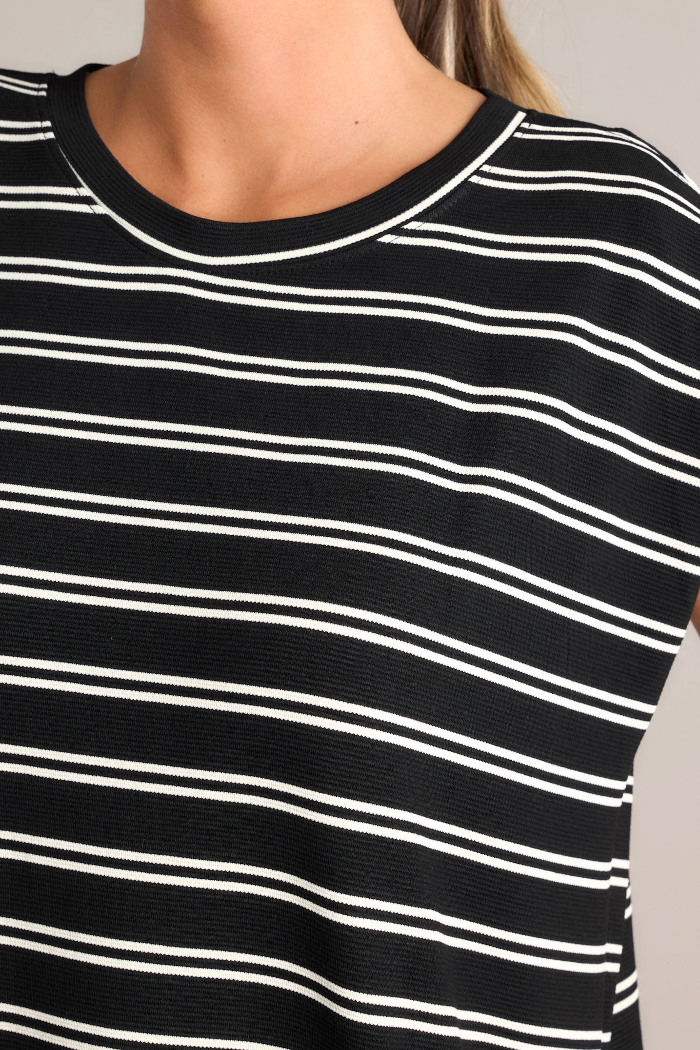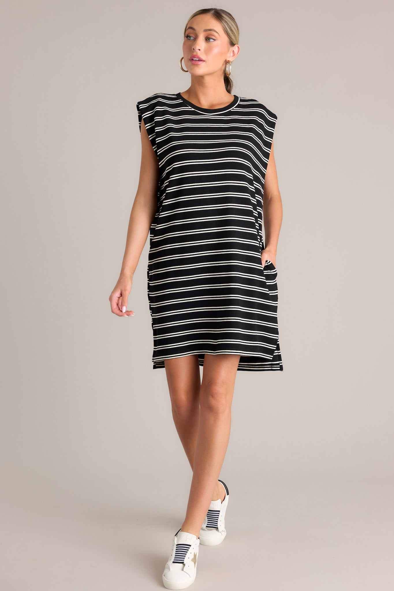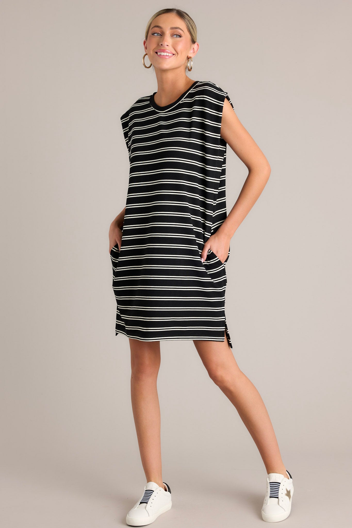 Sail away in style with the Vintage Voyage Black Stripe Cap Sleeve Mini Dress! This unique dress features a playful cap sleeve design and a trendy stripe pattern. Perfect for taking a trip to the beach or a day of shopping, this dress will have you looking chic and feeling comfortable. This black stripe mini dress features a crew neckline, short cap sleeves, a double stripe pattern, functional hip pockets, and a split hemline.