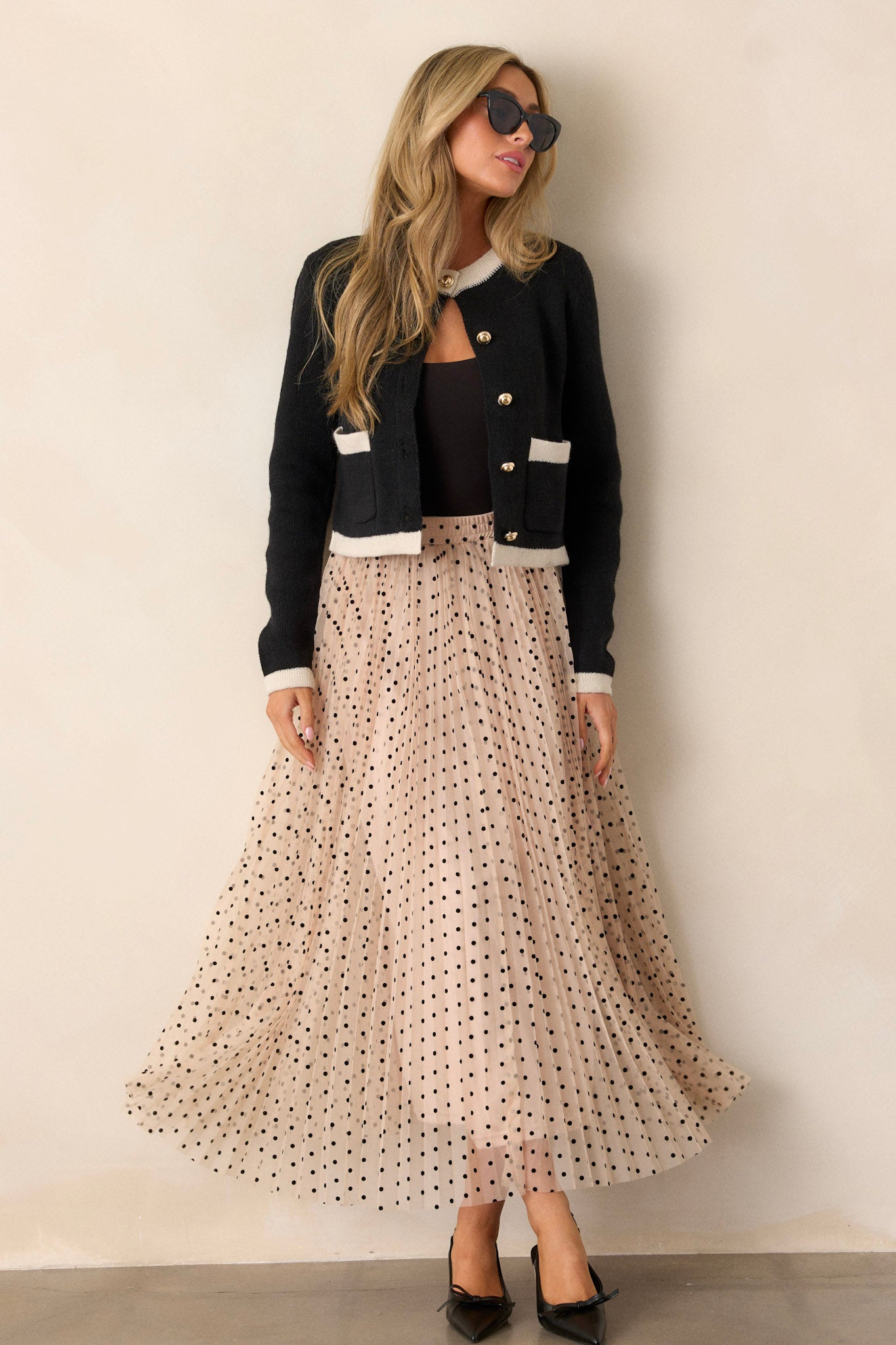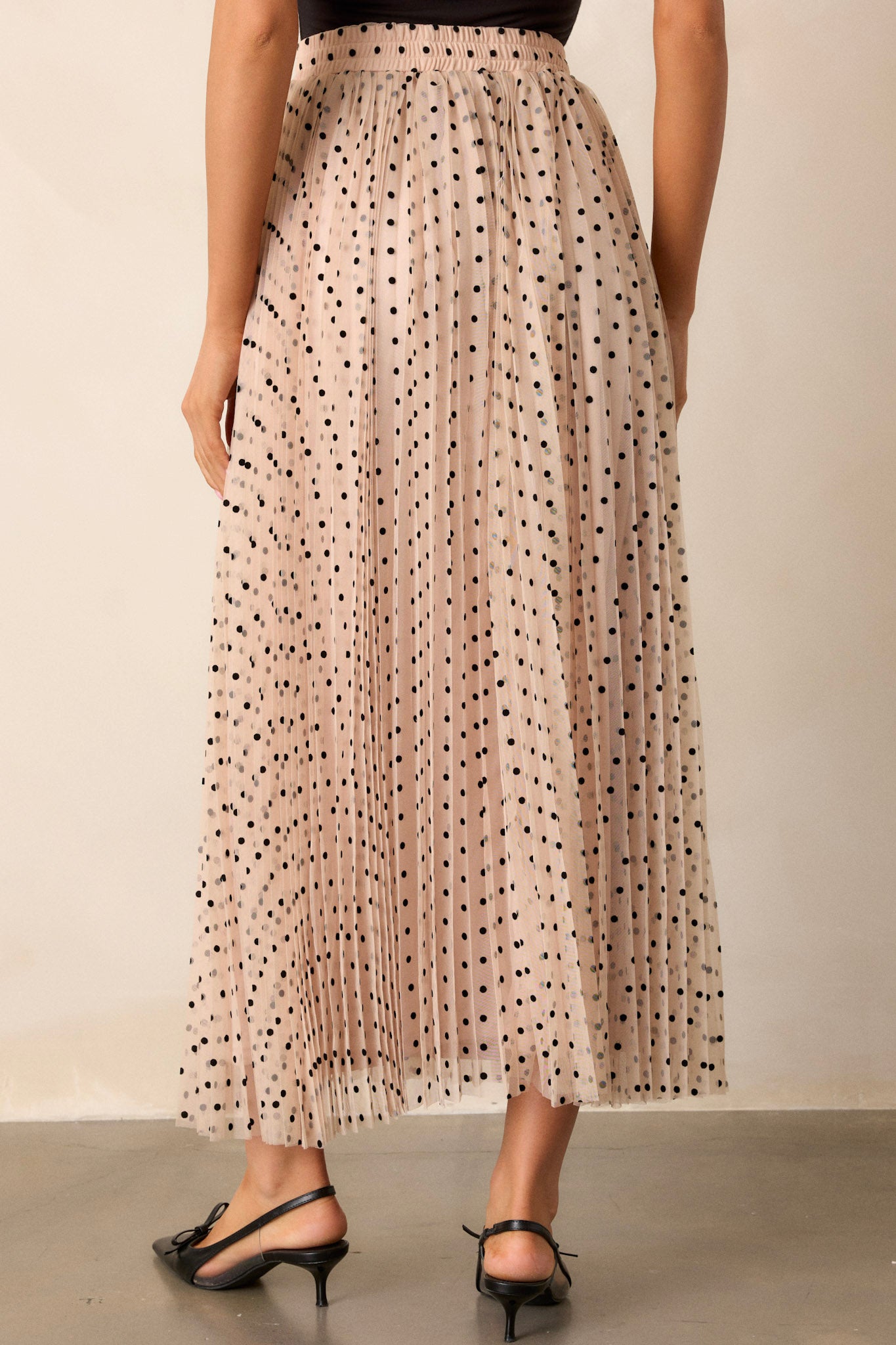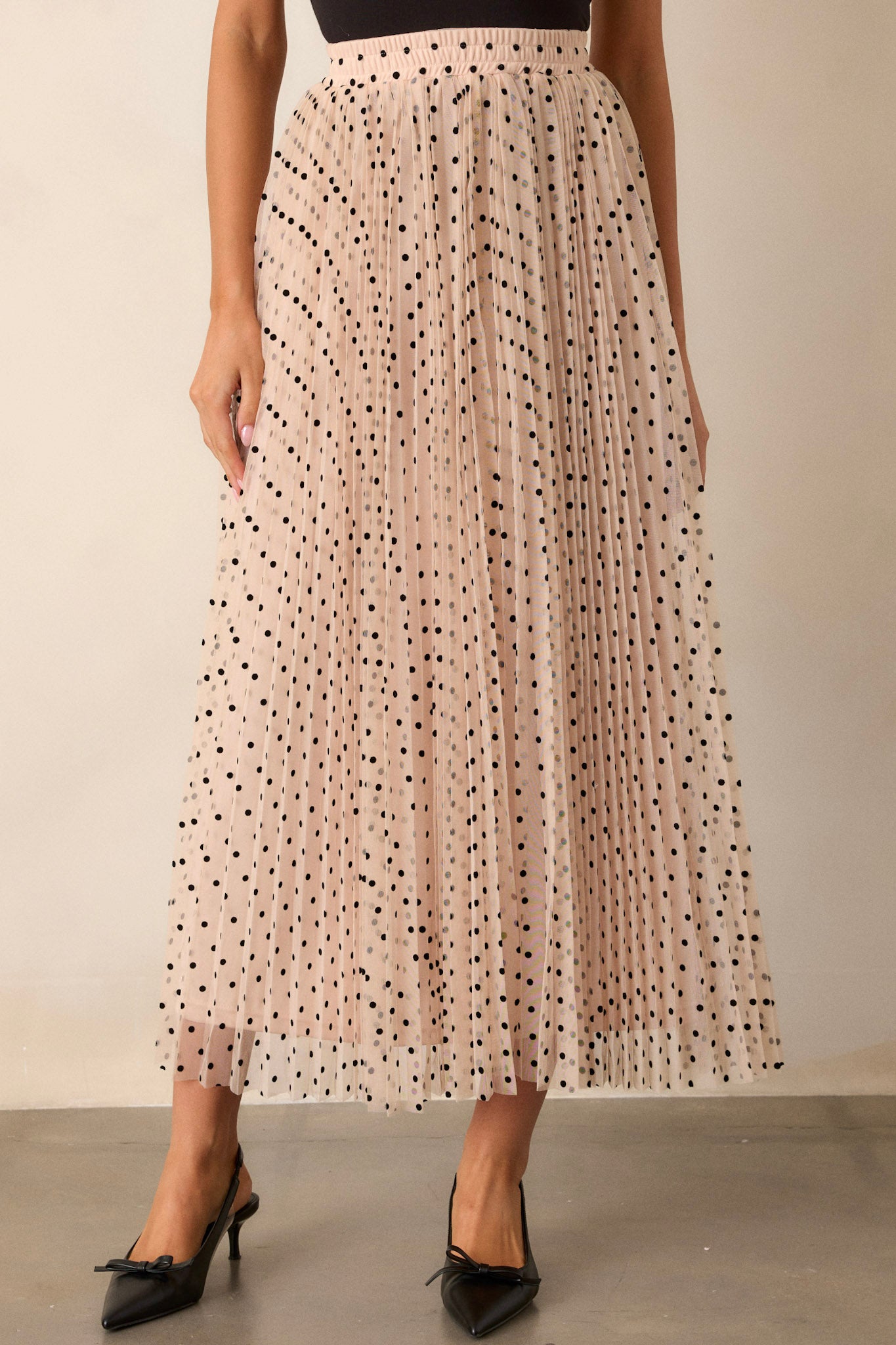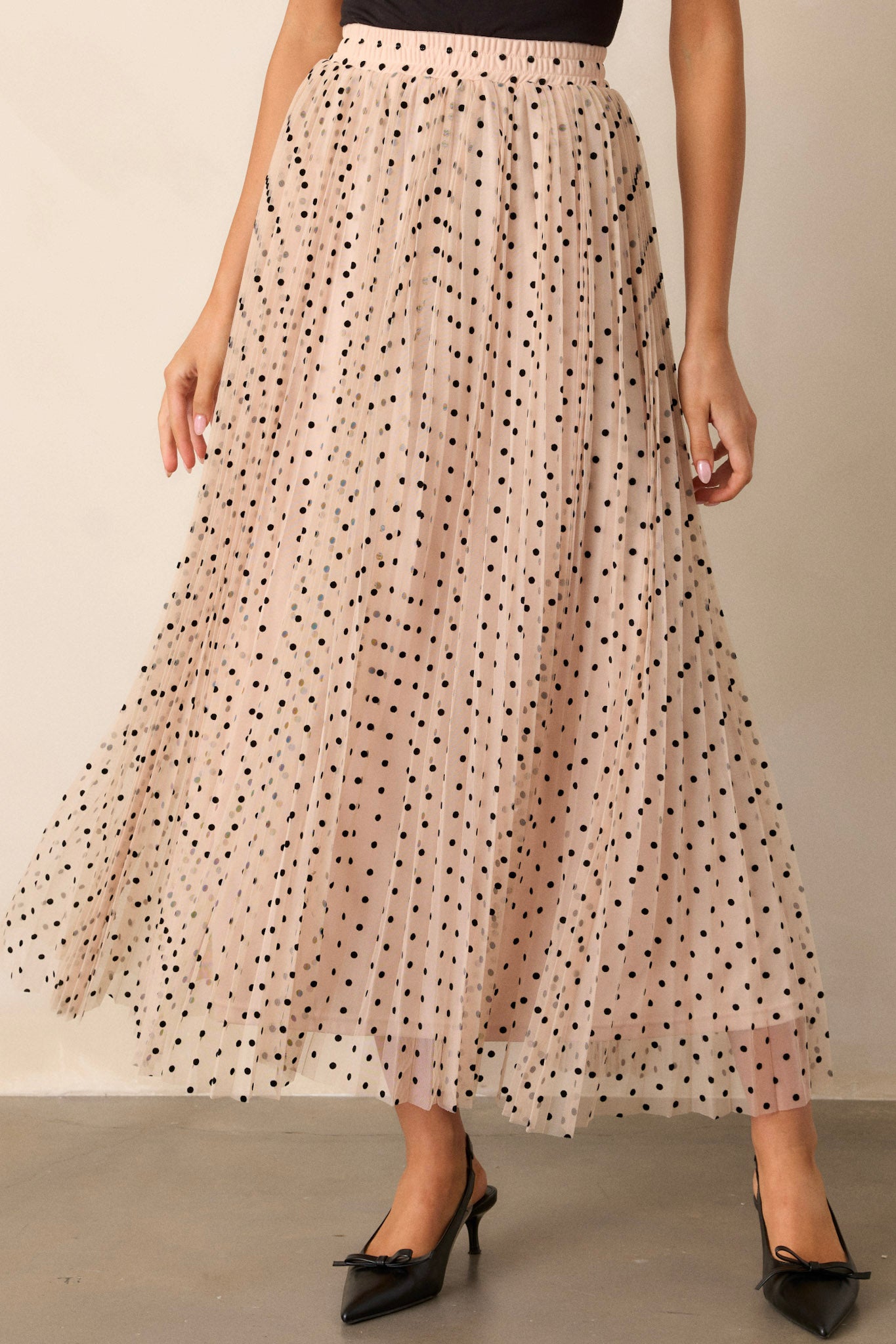 Introducing our Vintage Wave Beige Tulle Polka Dot Maxi Skirt! Channel retro vibes with this playful skirt, featuring a flouncy tulle design and whimsical polka dot pattern. Perfect for twirling on the dance floor or adding a touch of vintage flair to your wardrobe. Pair with your favorite top for a fun and flirty look. This polka dot beige skirt features a high waisted design, an elastic waist band, a pleated design, and a flowing silhouette.