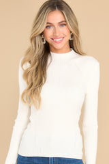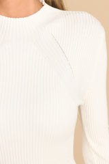 Flaunt your fashionista finesse with the Vision of Charm Ivory Ribbed Top! With its everyday-ready mockneck and transitional style, this top will take your wardrobe to the next level. This sweater features a mock neck, long sleeves, ribbed detailing, a fitted silhouette, and a soft texture. Model is wearing a size small. • 56% Viscose, 29% Polyester, 19% Nylon • Hand Wash Cold • Unlined • Imported