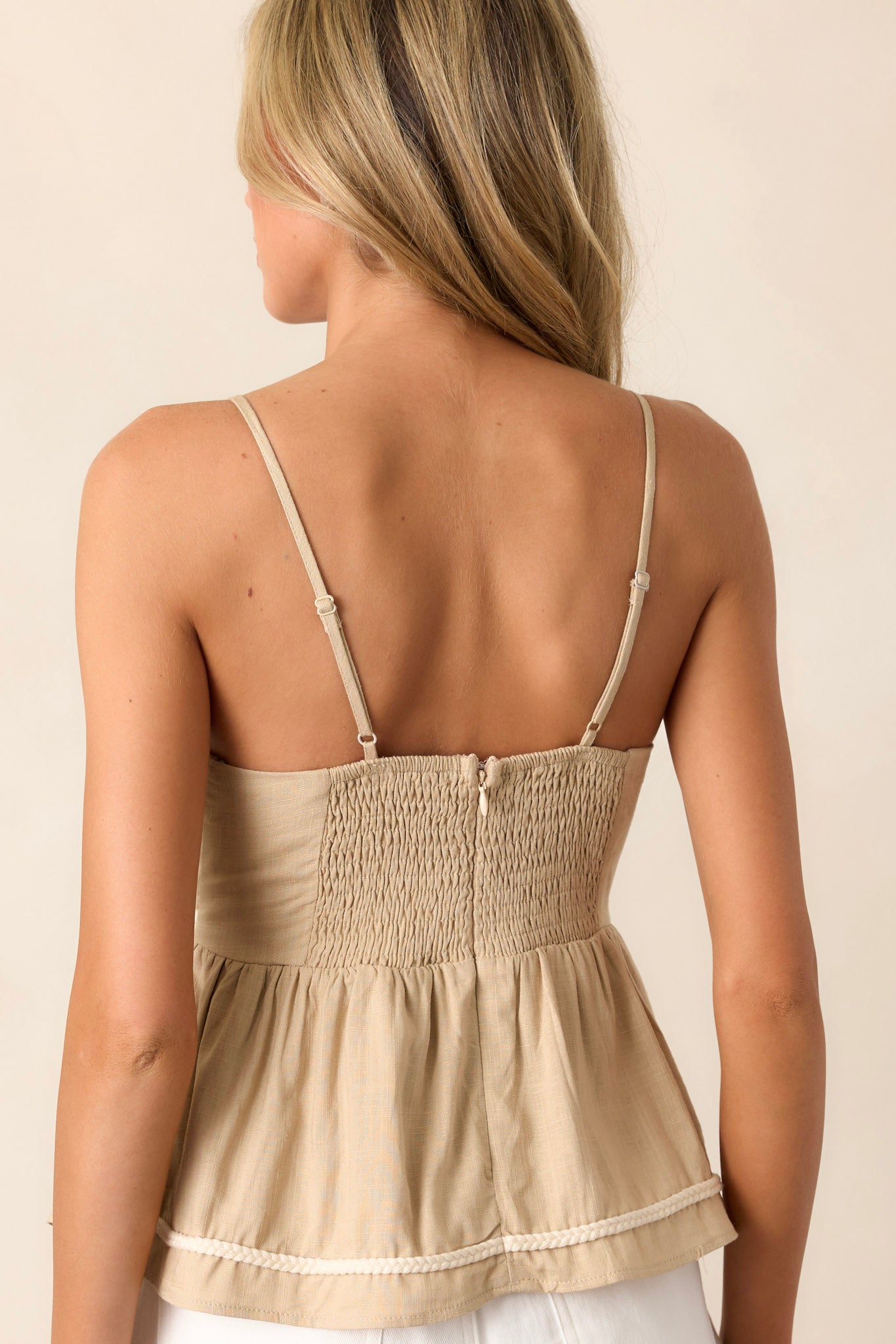 Introducing our Waiting For You Tank Top, featuring a stunning tan braided trim that adds a touch of classiness to your summer wardrobe. This top boasts a comfortable fit and versatile design, perfect for any occasion. Upgrade your style and embrace the warm weather with our must-have tank top. This top features a smocked back with a functional zipper, adjustable stripes, a babydoll style, and a white braided cord design.