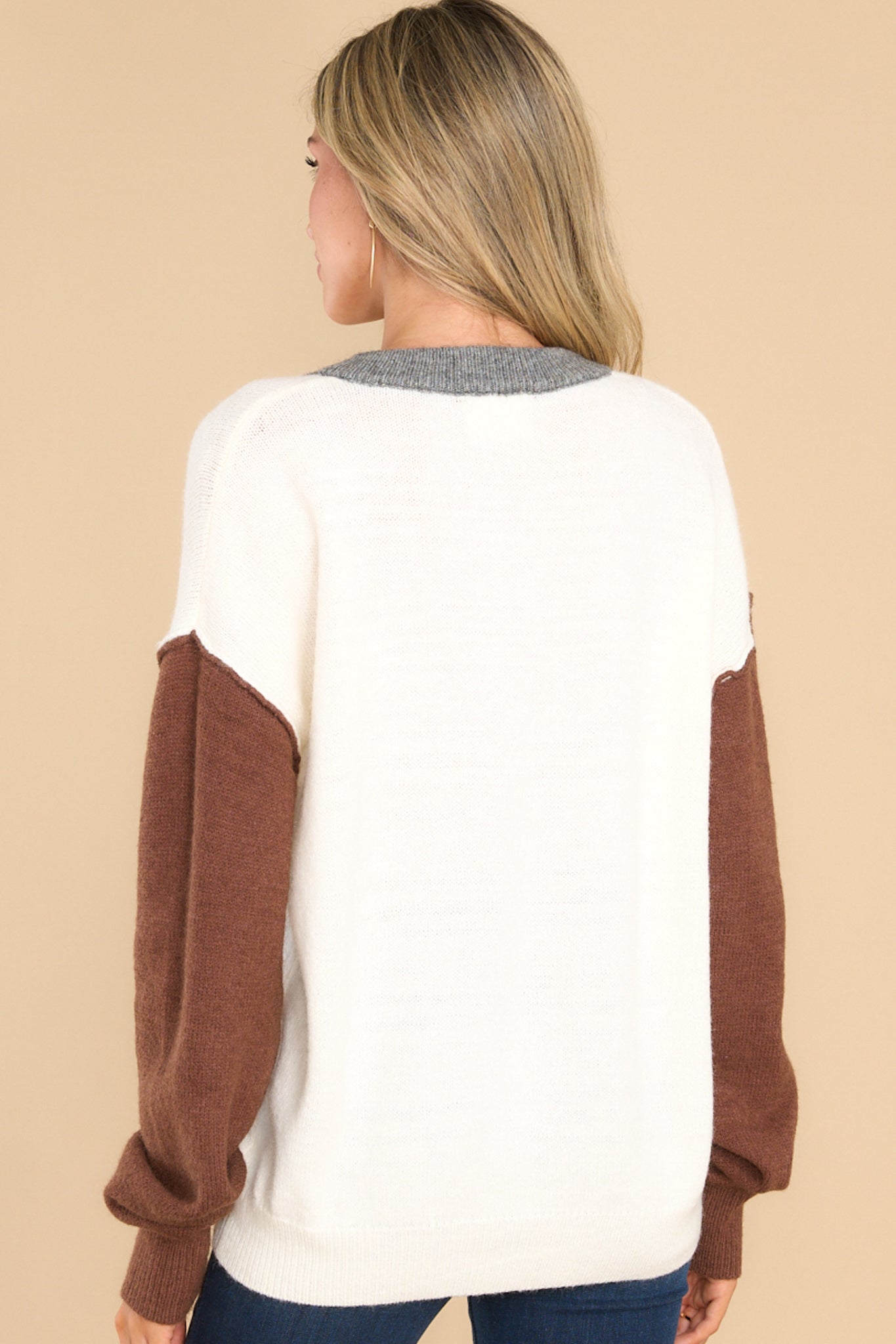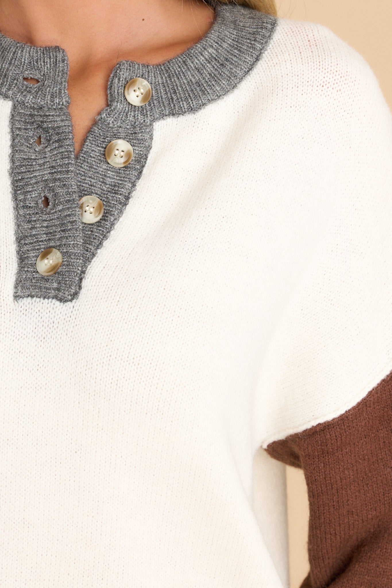 Stay warm and chic with the Wandered Off Beige Sweater. Perfect for cozy nights in, this sweater is the ideal mix of comfy and stylish. Look great, but feel even better! This sweater features a round neckline with a functional four button closure in the front, long sleeves with tapered cuffs, and a neutral colorblock pattern. Model is wearing a size small. • 42% Acrylic, 30% Polyester, 28% Nylon • Hand Wash Cold • Imported