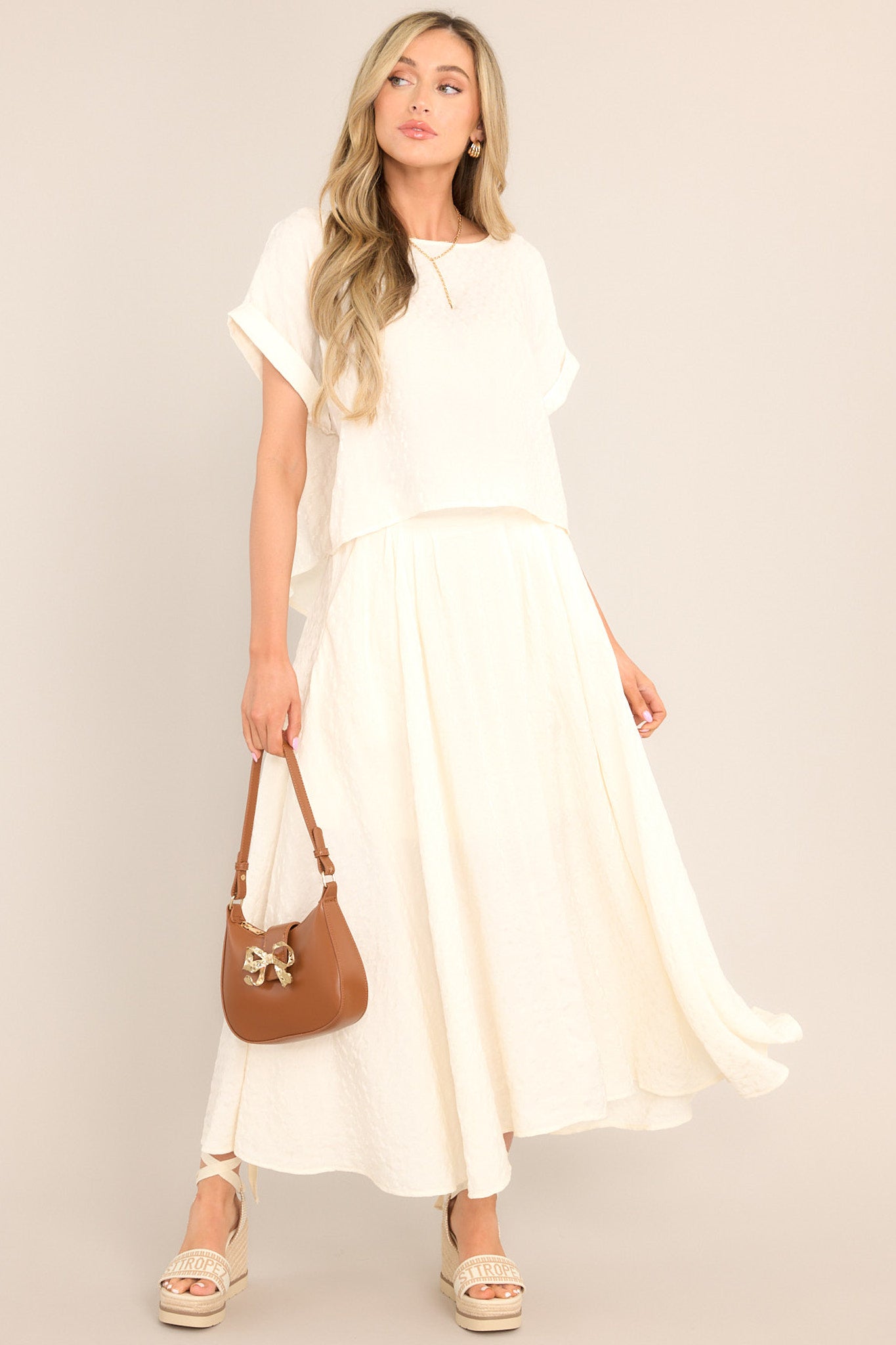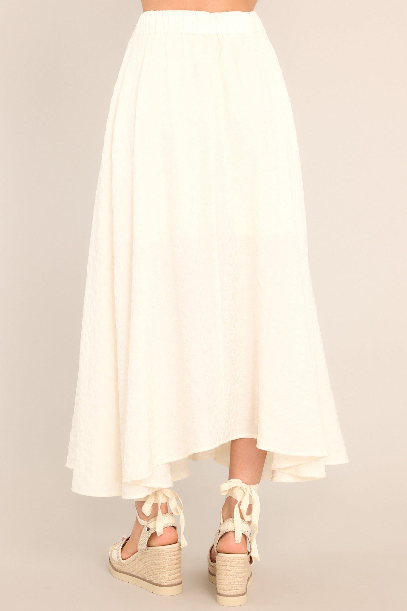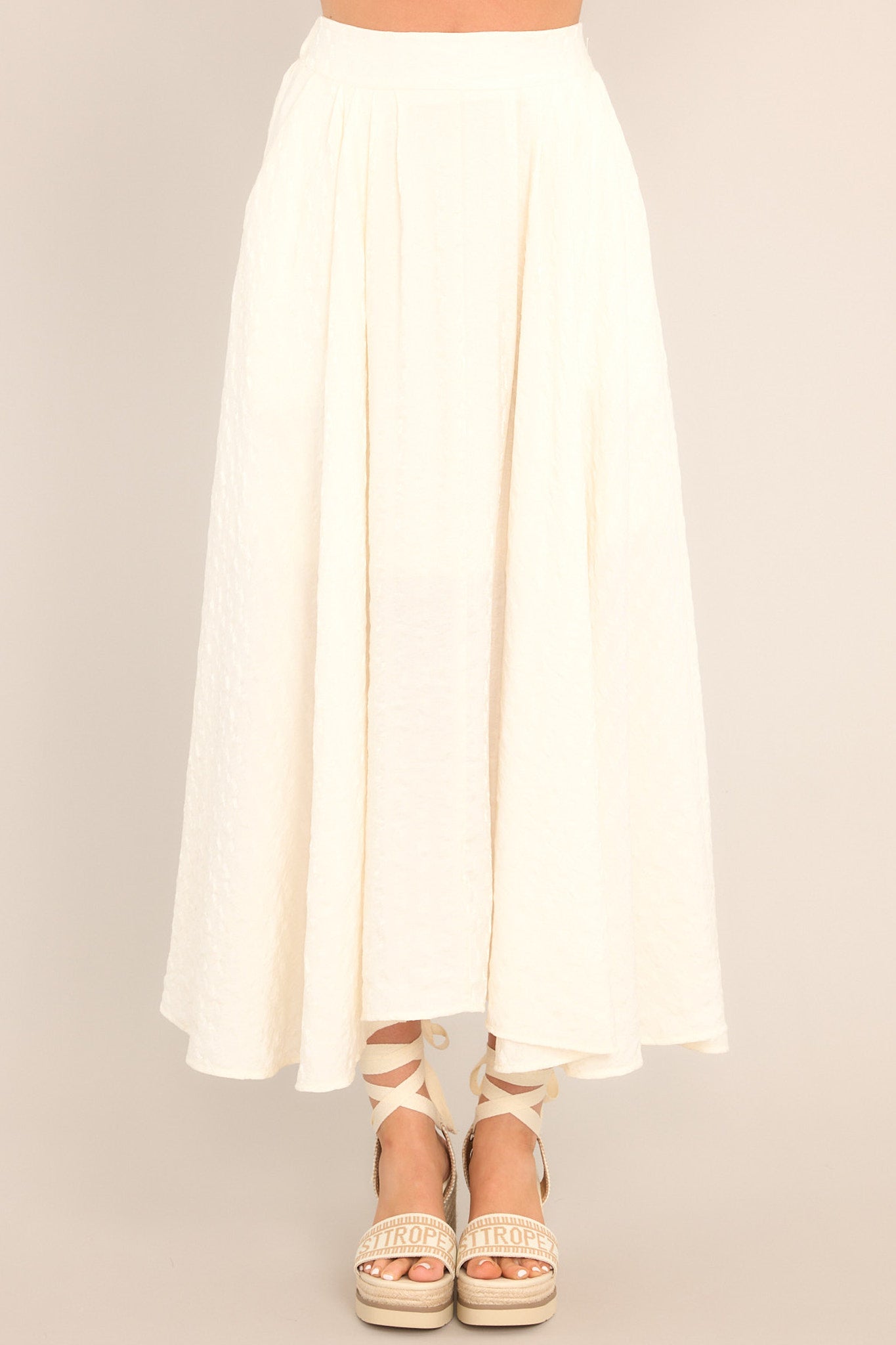 Elevate your style with our What Makes Life Great Ivory Maxi Skirt. This stunning piece offers comfort and versatility with its flowy design and elastic waistband. Perfect for any occasion, embrace the greatness of life in this quirky and whimsical skirt. This skirt features a high waisted design, an elastic insert at the back of the waist, a subtle shimmering hue, functional pockets, and a lot of flowing fabric.