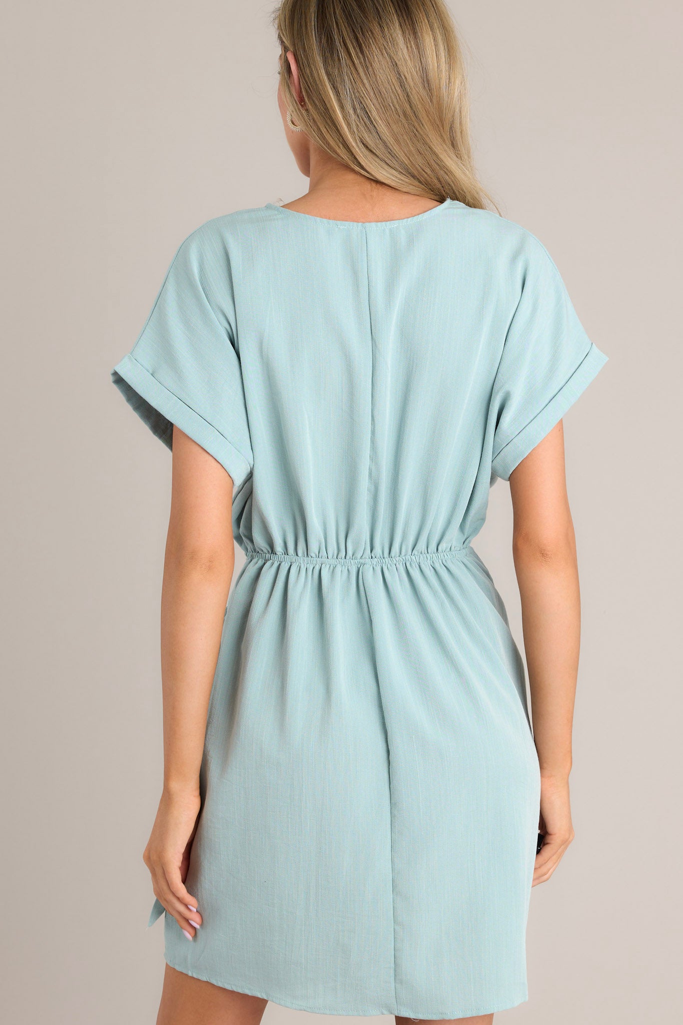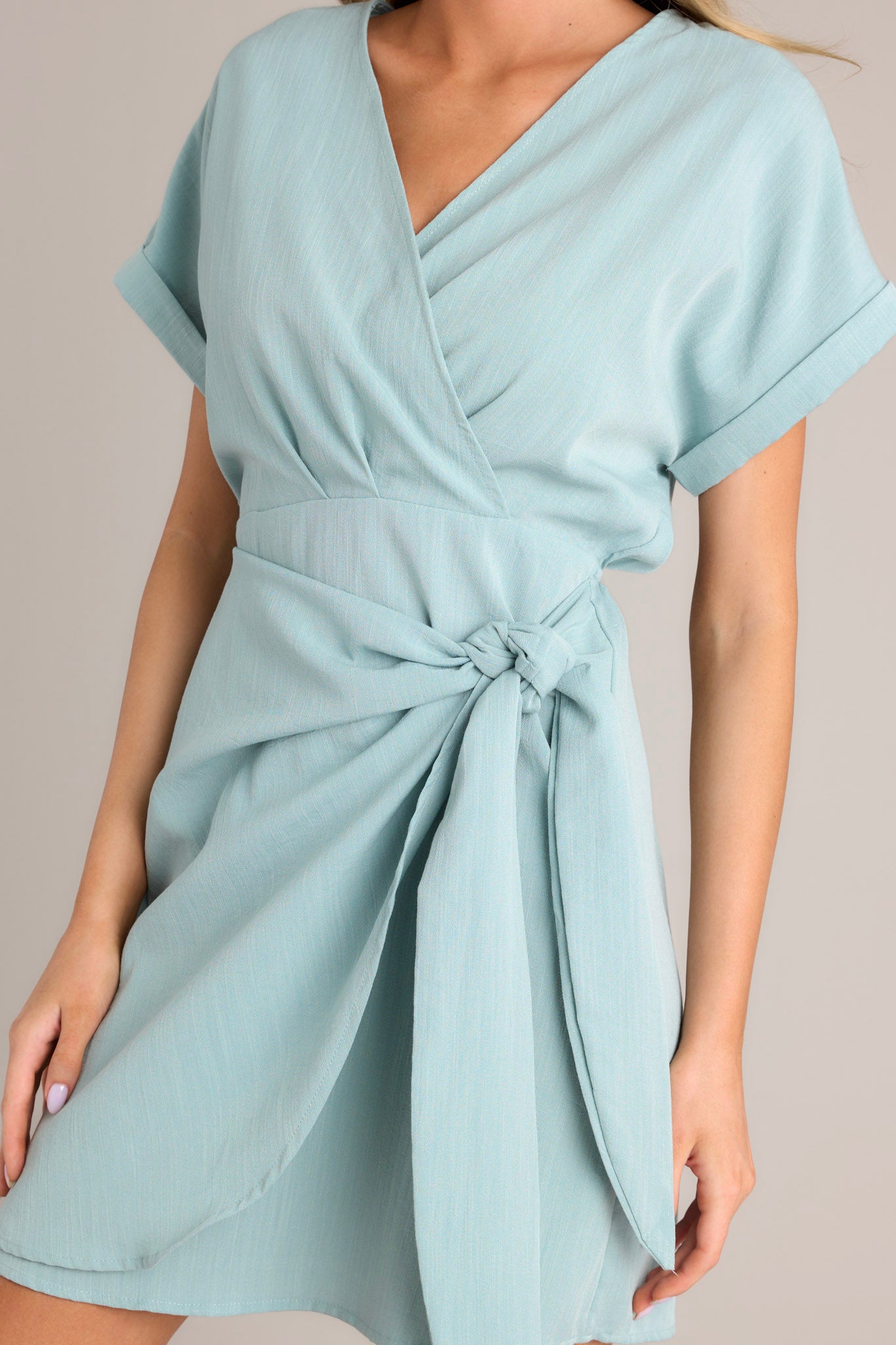 Dance your way into the summer with our Whirling Daydreams Mini Dress! This seafoam green wrap dress flatters all shapes and sizes, creating the perfect silhouette for any occasion. Embrace the wrap trend and turn heads in this playful and versatile piece! This dress features a v-neckline, an elastic waist insert, a self-tie wrap feature, and wide cuffed short sleeves.