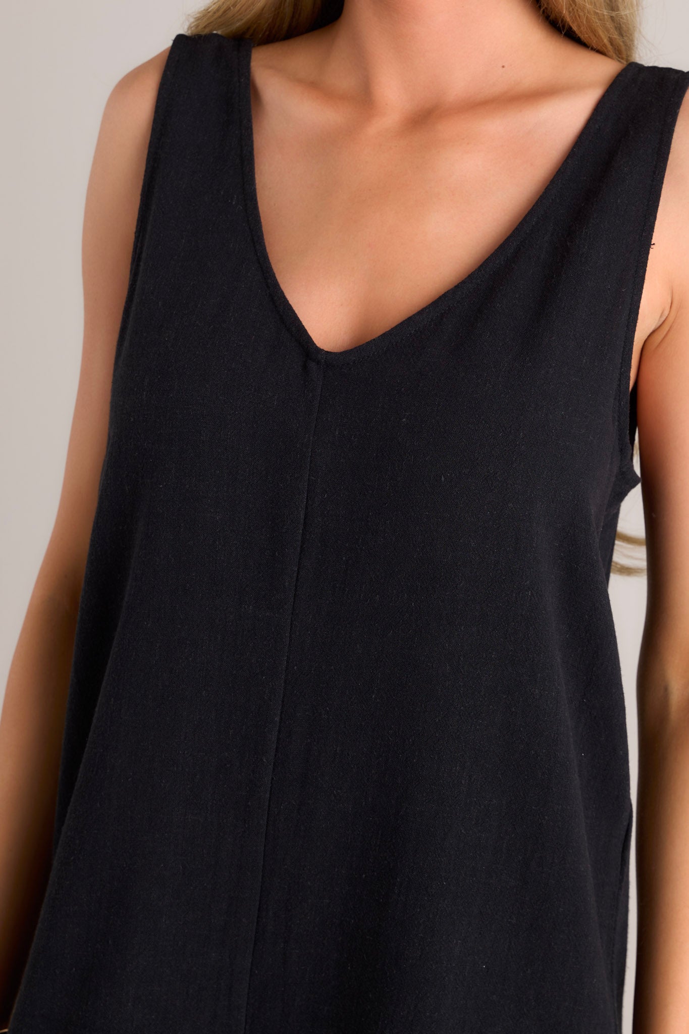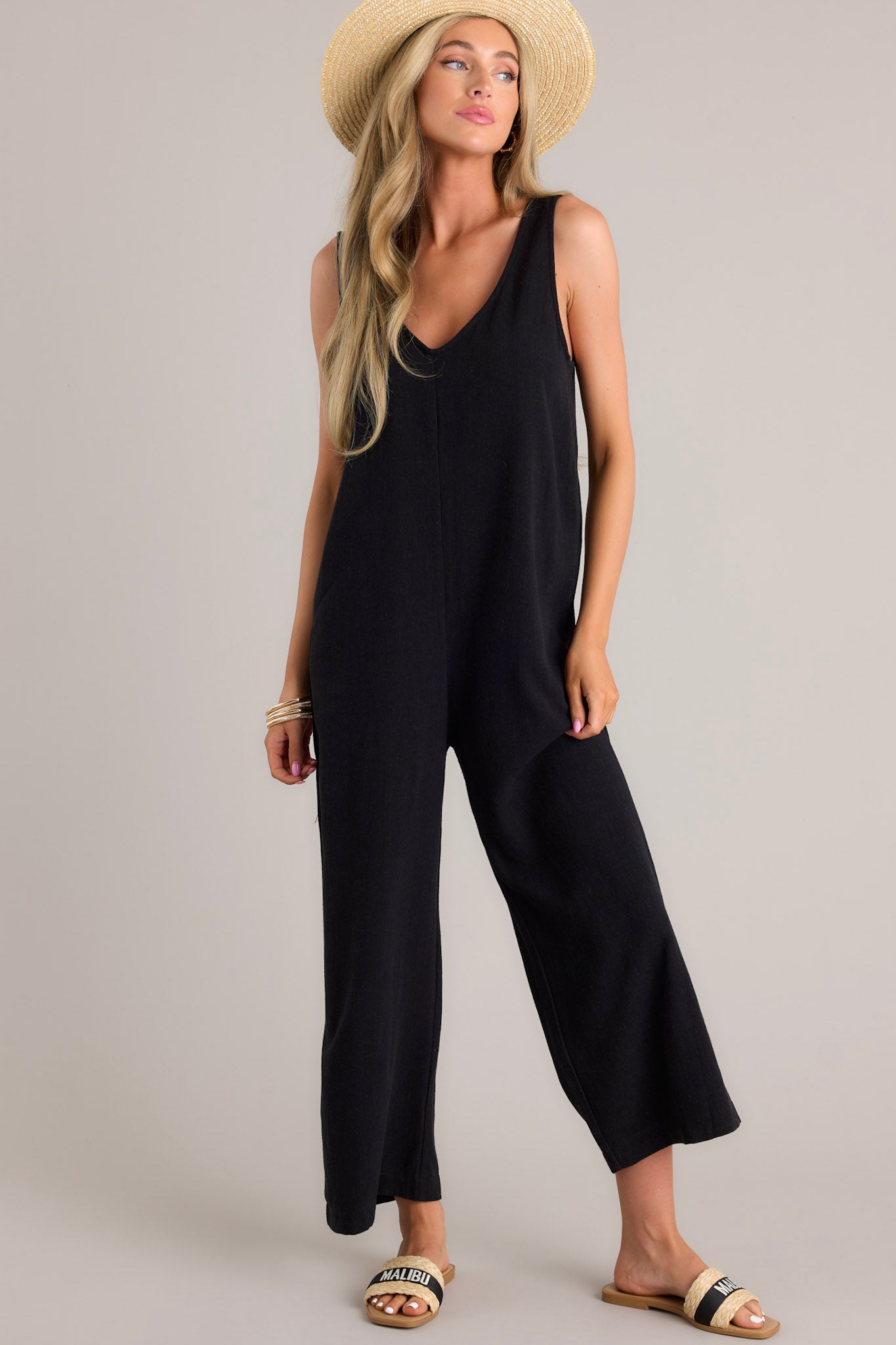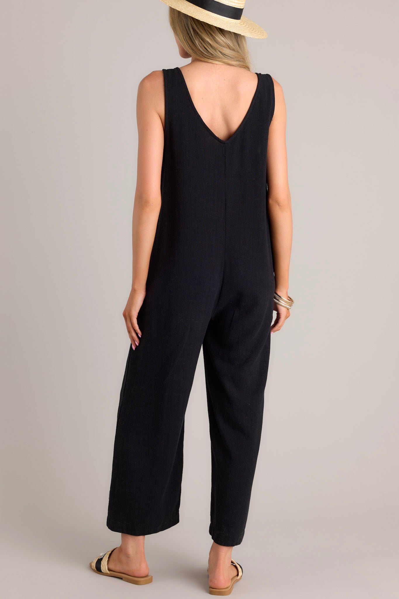 Experience the ultimate fashion revolution with our Whirlwinds of Change jumpsuit! Perfect for any occasion, this black jumpsuit combines comfort and style in one. Say goodbye to boring outfits and hello to a whirlwind of change! This black jumpsuit features a v-neckline, a lightweight material, a wide leg, and a slightly cropped hemline.