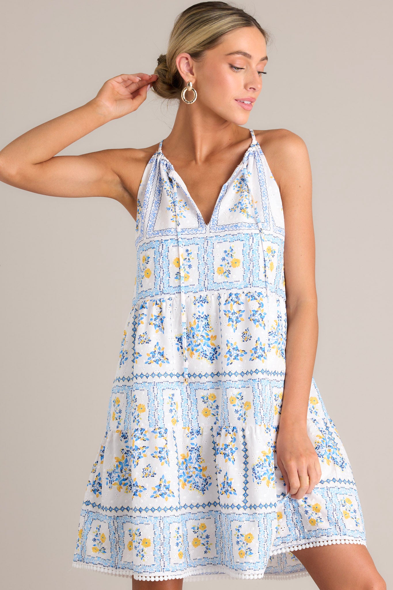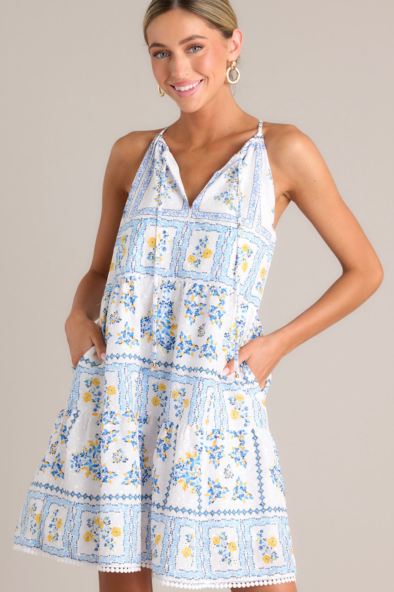Get ready to strut your stuff in the Whispering Meadows White & Blue Embroidered Mini Dress! With its delicate embroidery and playful mix of blue and yellow, you'll be the life of the party. Perfect for any summer occasion, this dress will have you feeling confident and stylish! This white and blue mini dress features a v-neckline with a self-tie feature, a tiered design, functional hip pockets, and embroidery throughout.