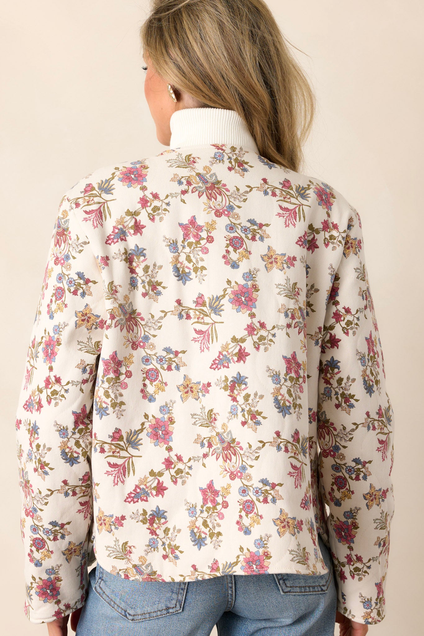 Our Wild Honey Ivory Floral Crew Neck Denim Jacket will add a touch of whimsy to any outfit. Its multi-button front offers a customizable fit, while the fabric allows for comfortable wear throughout the day. Perfect for adding a pop of color and style to your wardrobe. This ivory floral jacket features a crew neckline, functional buttons down the front, two functional hip pockets, and a floral denim fabric.