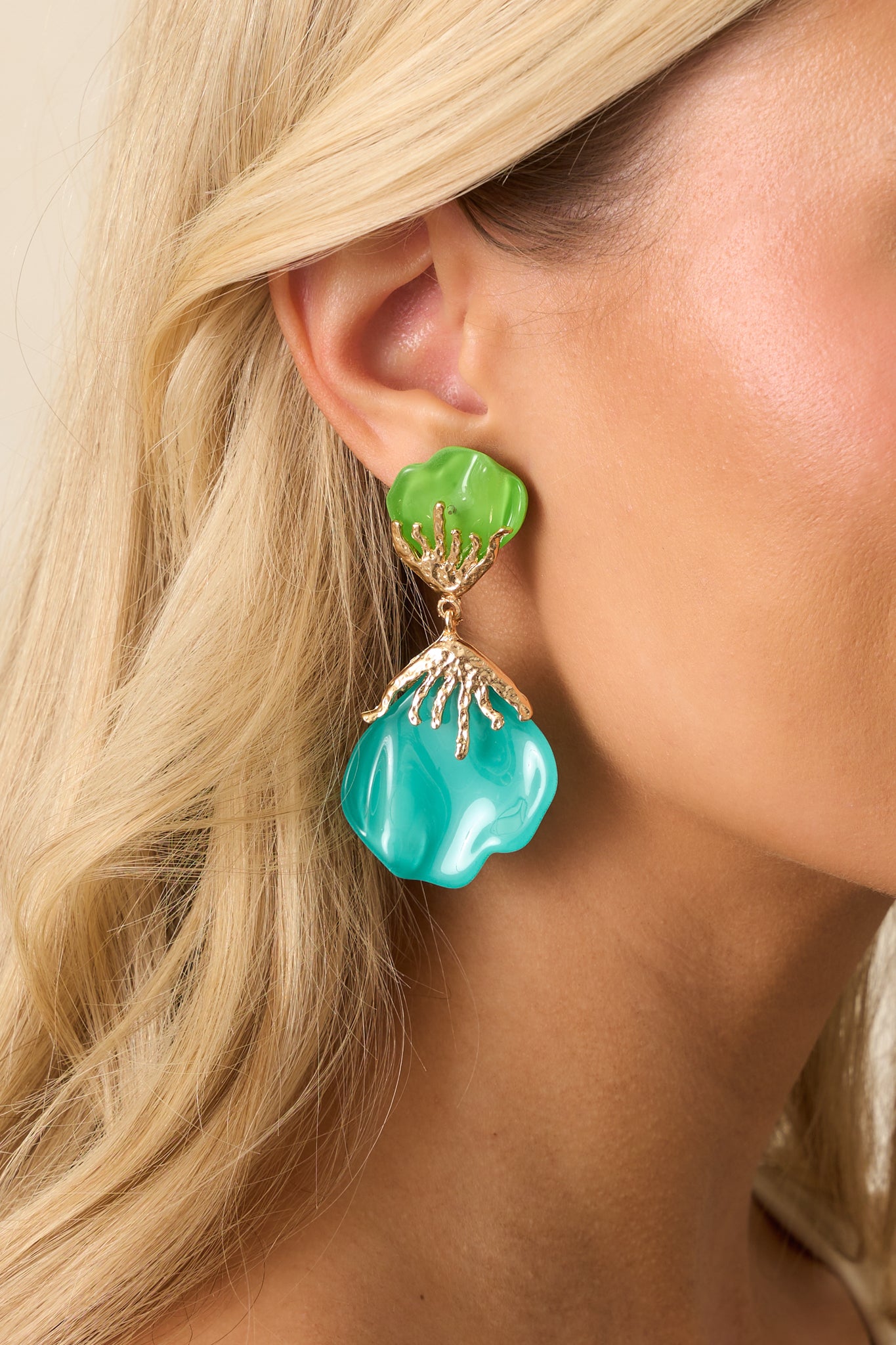 Experience the beauty and wonder of nature with Wildflower Muse green flower petal drop earrings. Each unique and delicate petal is carefully crafted to create a stunning and timeless accessory. Bring a touch of nature into your life and inspire others with these enchanting earrings. These teal green earrings feature a pearlescent finish, contrasting green & turquoise colored petal shapes, gold decorative details, and secure post backings.
