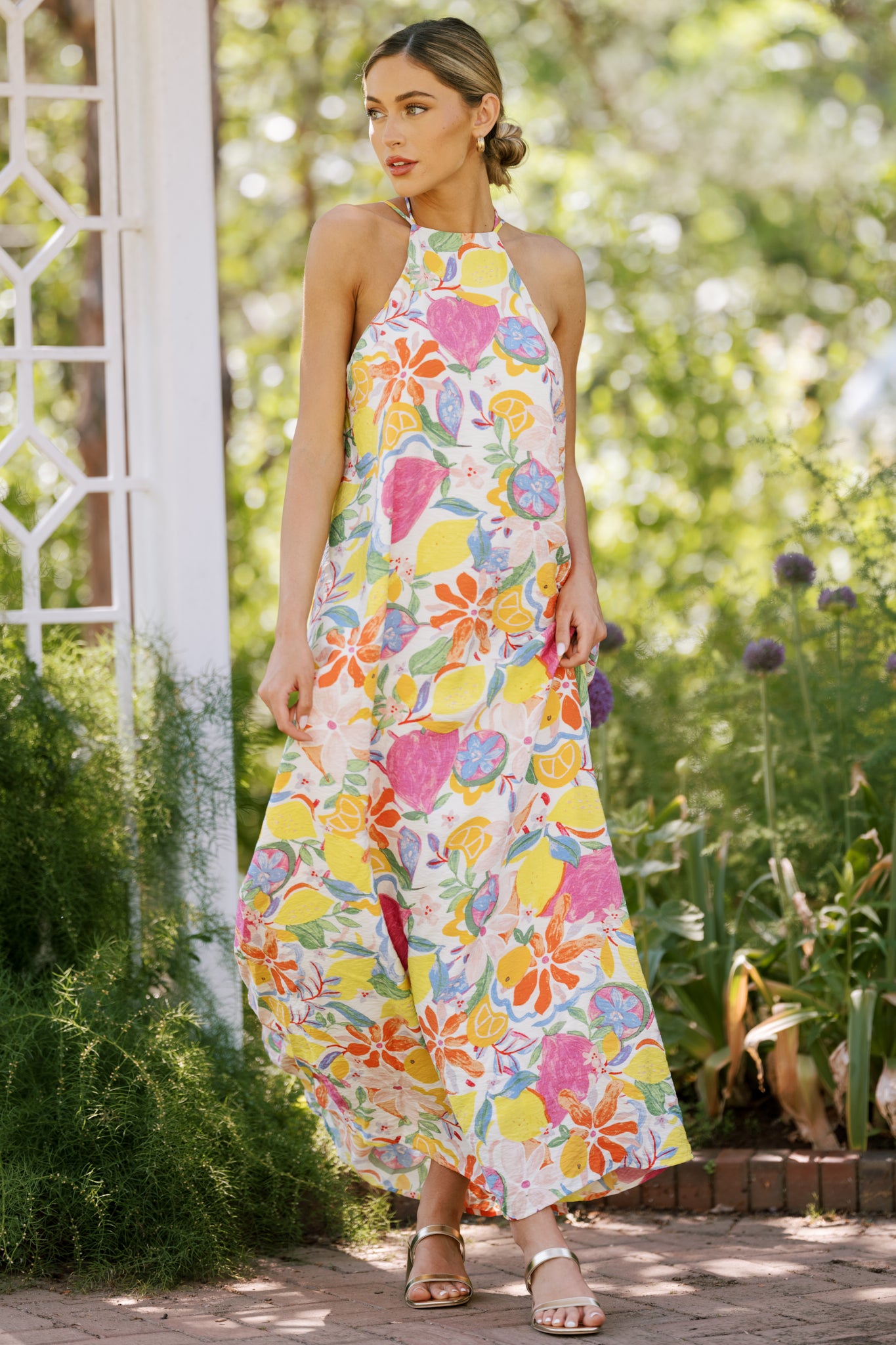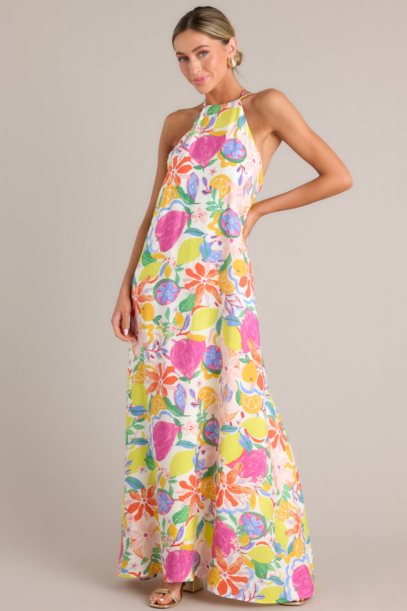Wildflower Whimsy Ivory Multi Floral Halter Maxi Dress