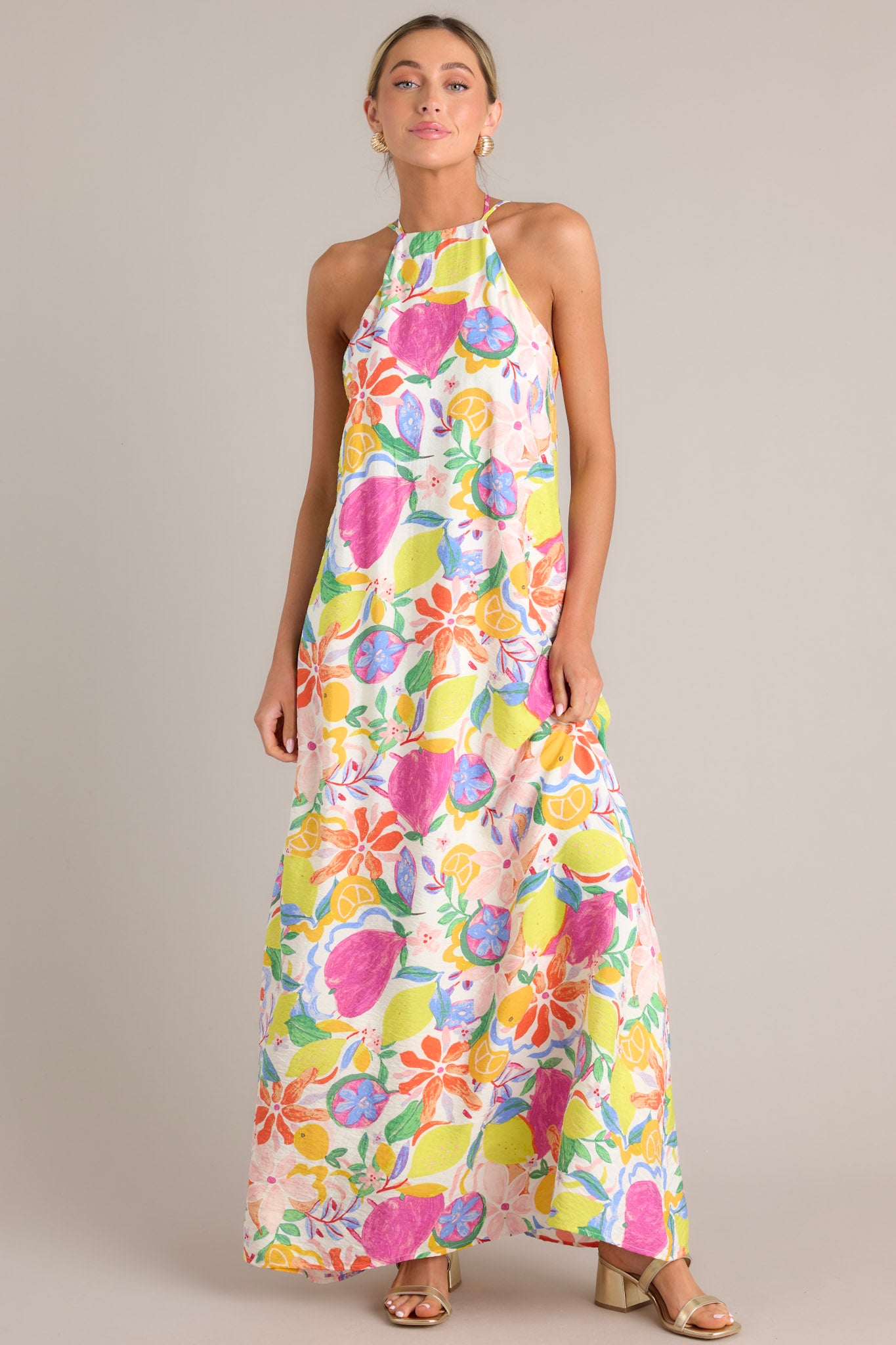 Be the epitome of wildflower whimsy in our Ivory Multi Floral Halter Maxi Dress. Featuring a halter neckline and a flowy maxi silhouette, this dress is perfect for your next outdoor adventure or special occasion. The multi-colored floral print adds a touch of playfulness to your look. You'll be the life of the party in this playful and stylish dress. This dress features a self-tie halter neckline, additional thin adjustable straps, an open back, a self-tie waist belt, and a flowing silhouette.