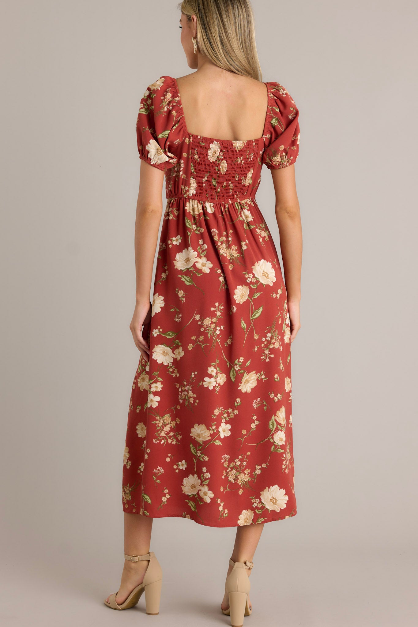 The Wish You Were Here Burnt Orange Puff Sleeve Midi Dress will have you standing out at any event. The unique color and trendy puff sleeves add a touch of flair while the midi length provides a classic and elegant look. Perfect for any occasion, this dress will make you wish you were there. This burnt orange dress features a square neckline with a slight v-neckline, a floral design, a smocked back insert, a slit in the left leg and short cinched puff sleeves.
