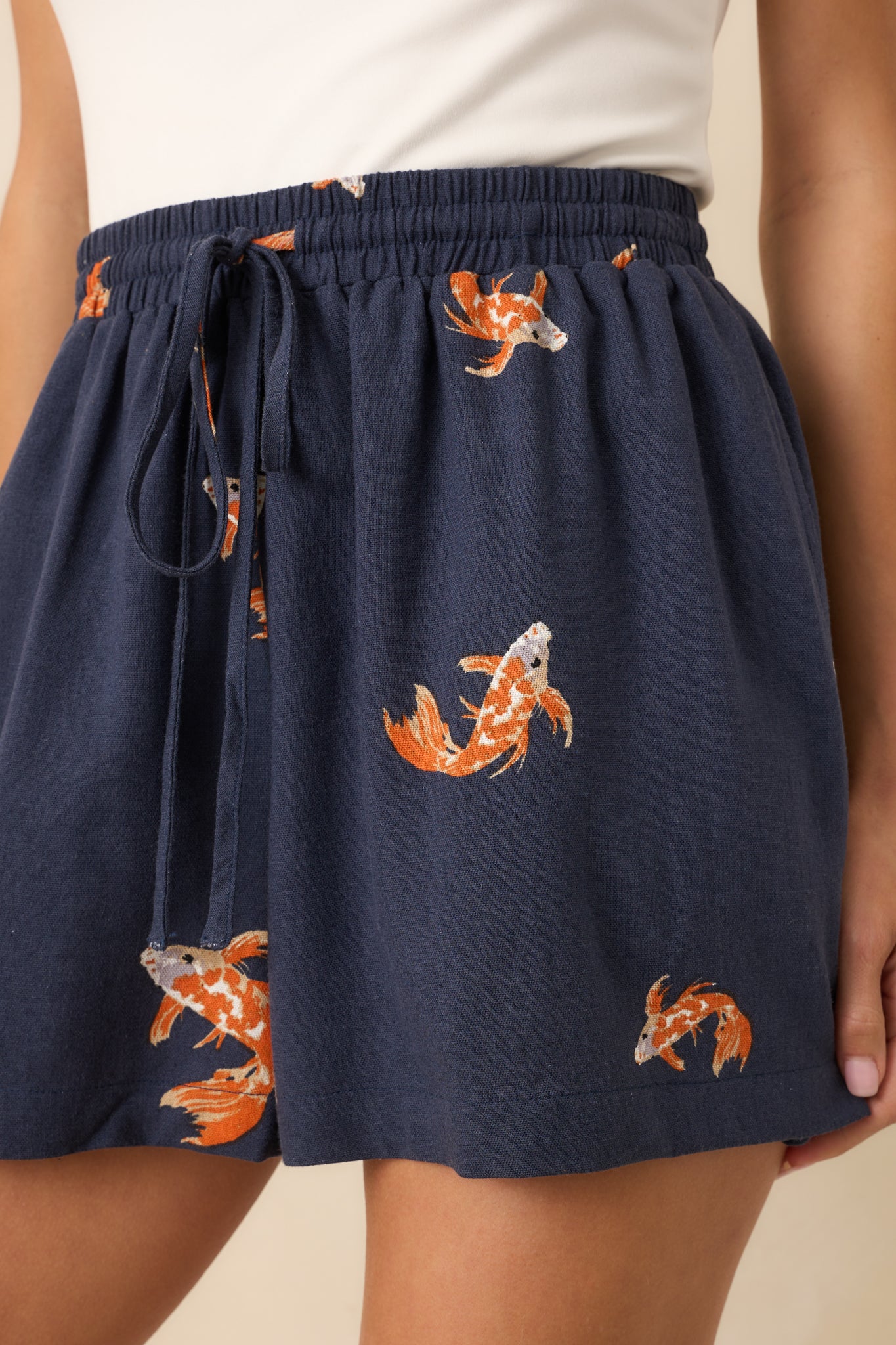 Within Reach Navy Koi Fish Print Linen Blend Drawstring Shorts