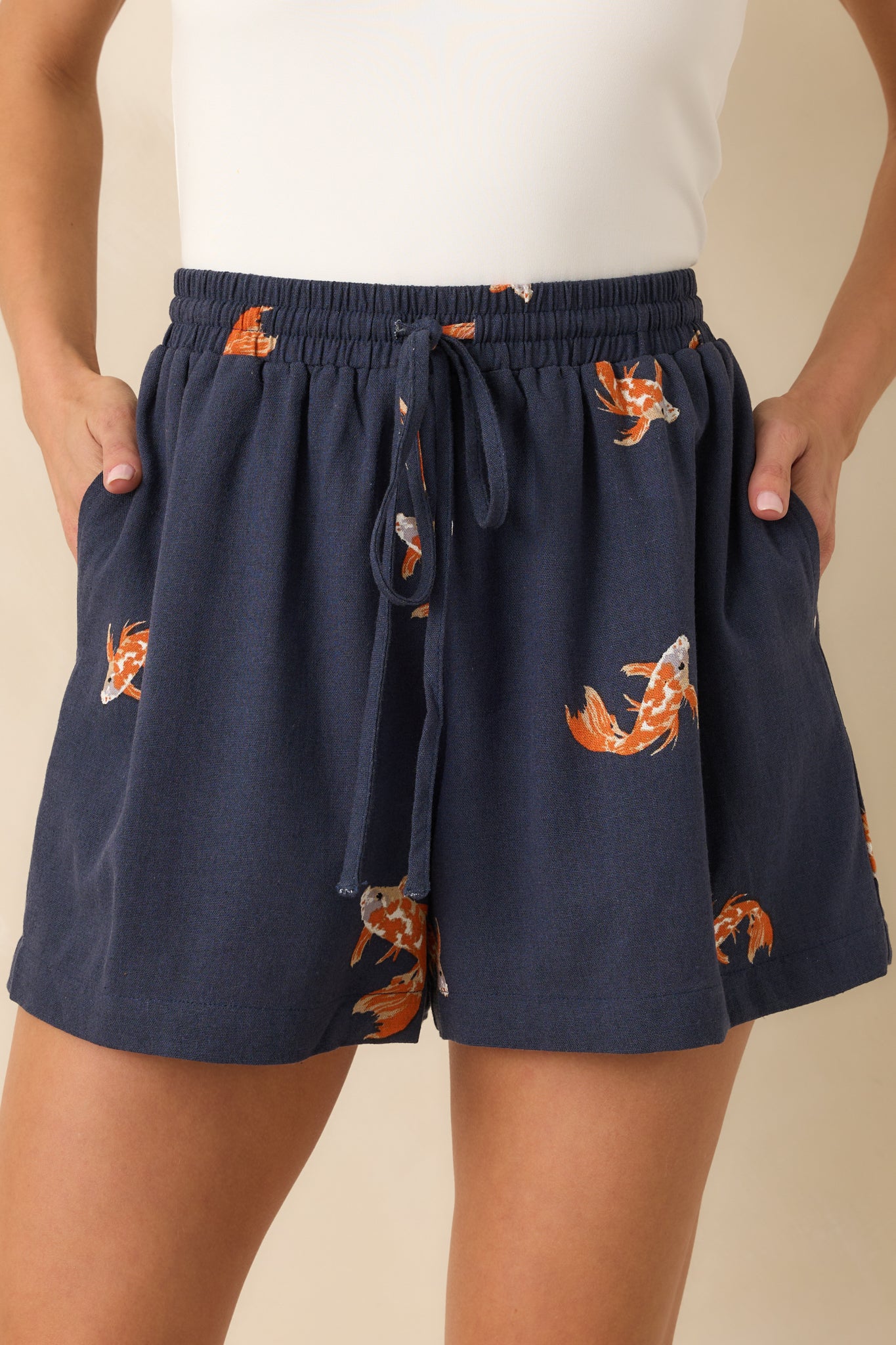 Within Reach Navy Koi Fish Print Linen Blend Drawstring Shorts are a reminder that the best moments are often the simplest. Playful and laid-back, they add a fun touch to your lineup—perfect for when you want comfort with a little personality. These navy shorts feature an orange koi fish print throughout, high rise design, elastic waistband, adjustable self-tie drawstring, and functional side seam pockets.