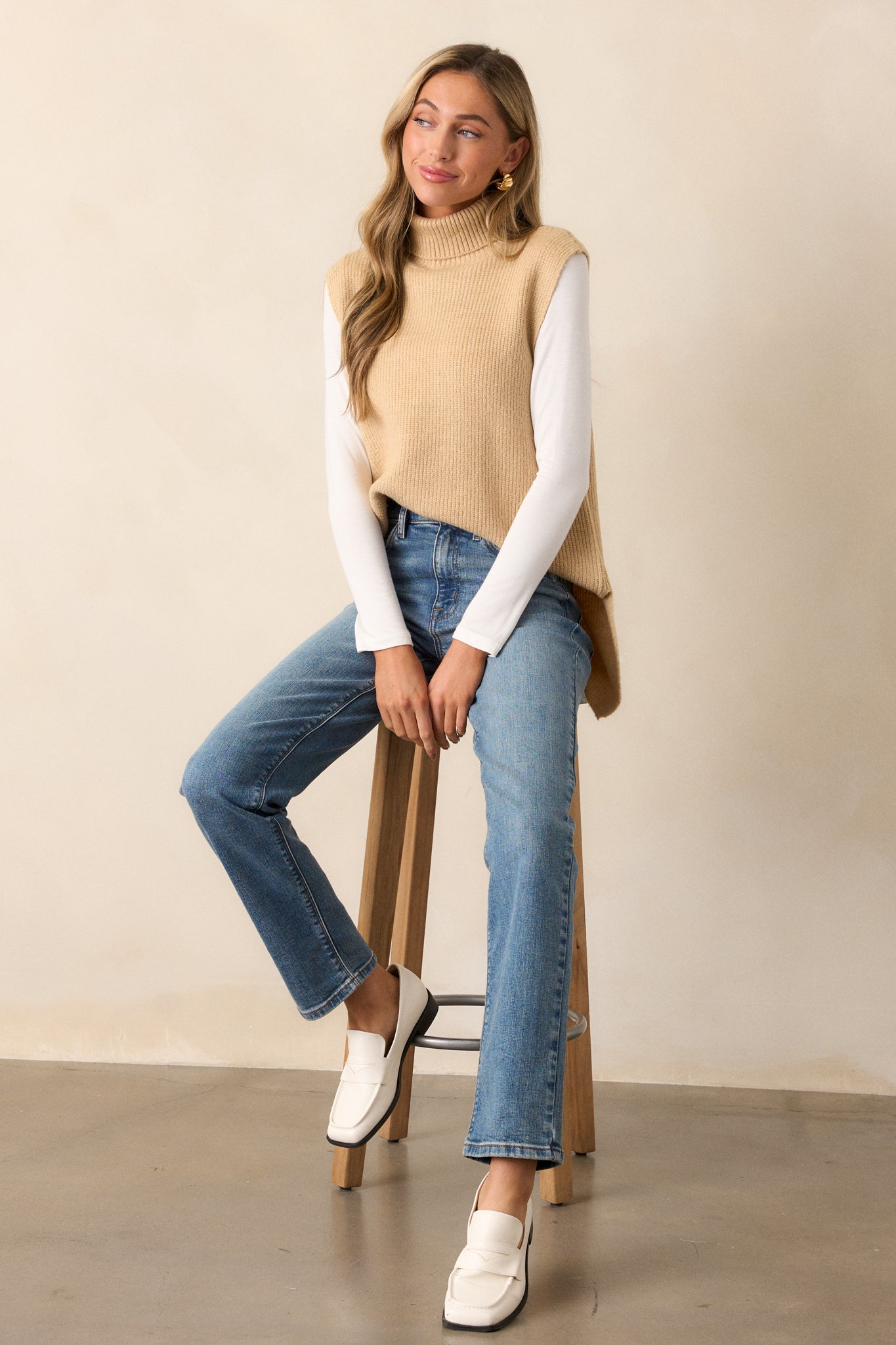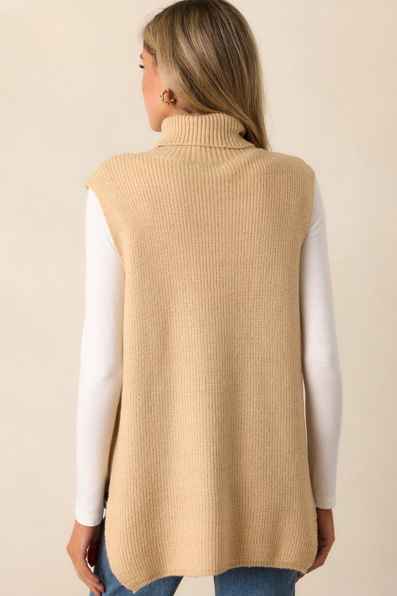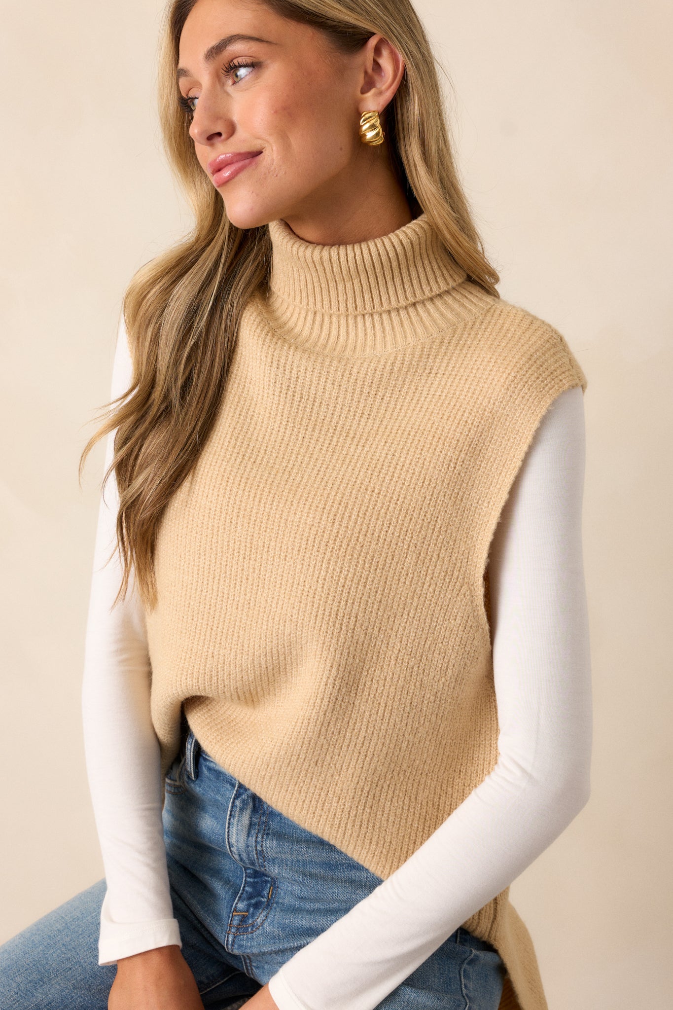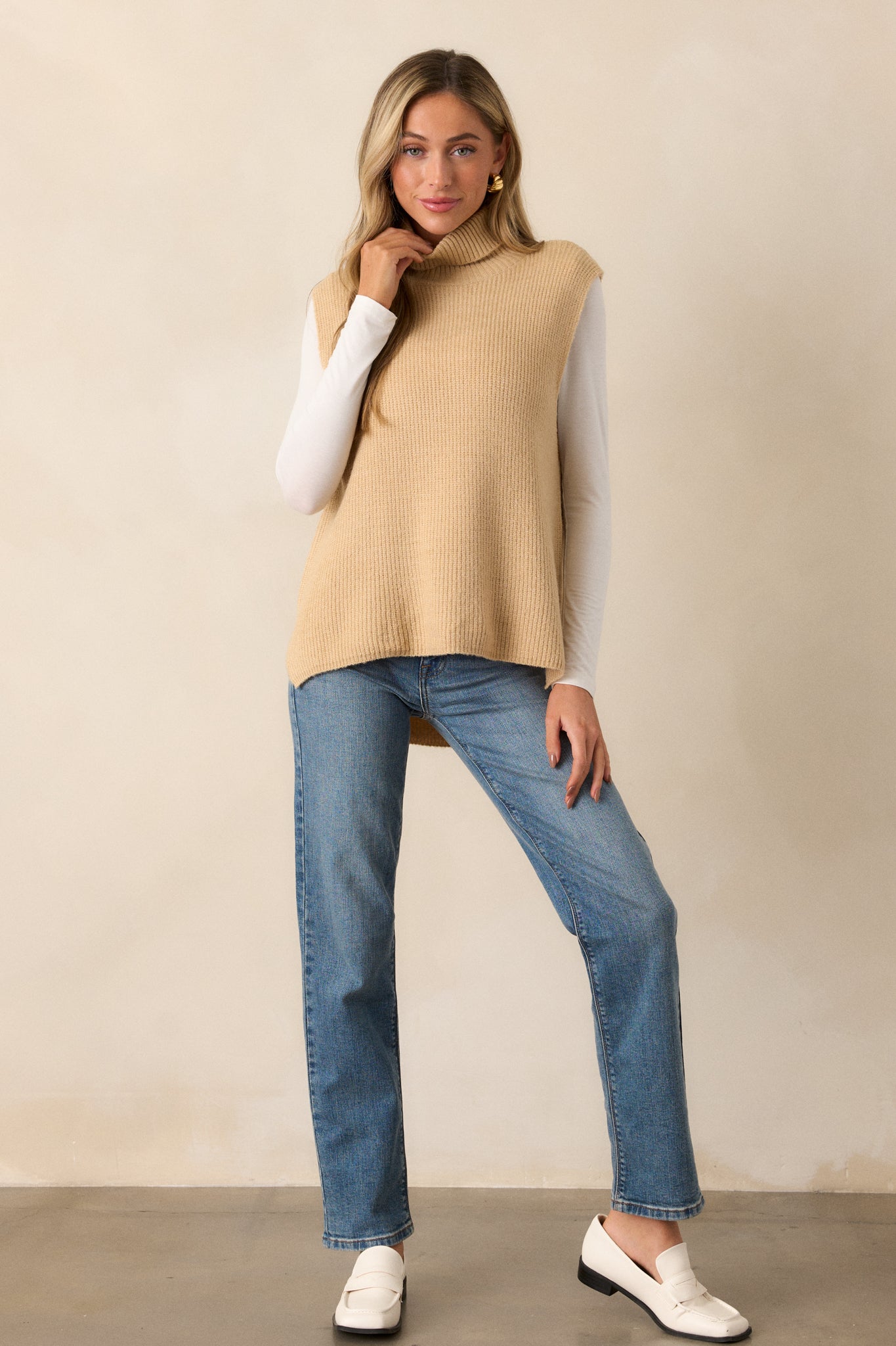 This taupe sweater vest combines comfort and style effortlessly. Its woven texture adds a touch of elegance, perfect for any occasion. Stay chic and cozy with this versatile piece that can be dressed up or down. This taupe sweater vest features a ribbed turtle neck, a soft sweater material, a boxy fit, side slit detailing and sleeveless design.