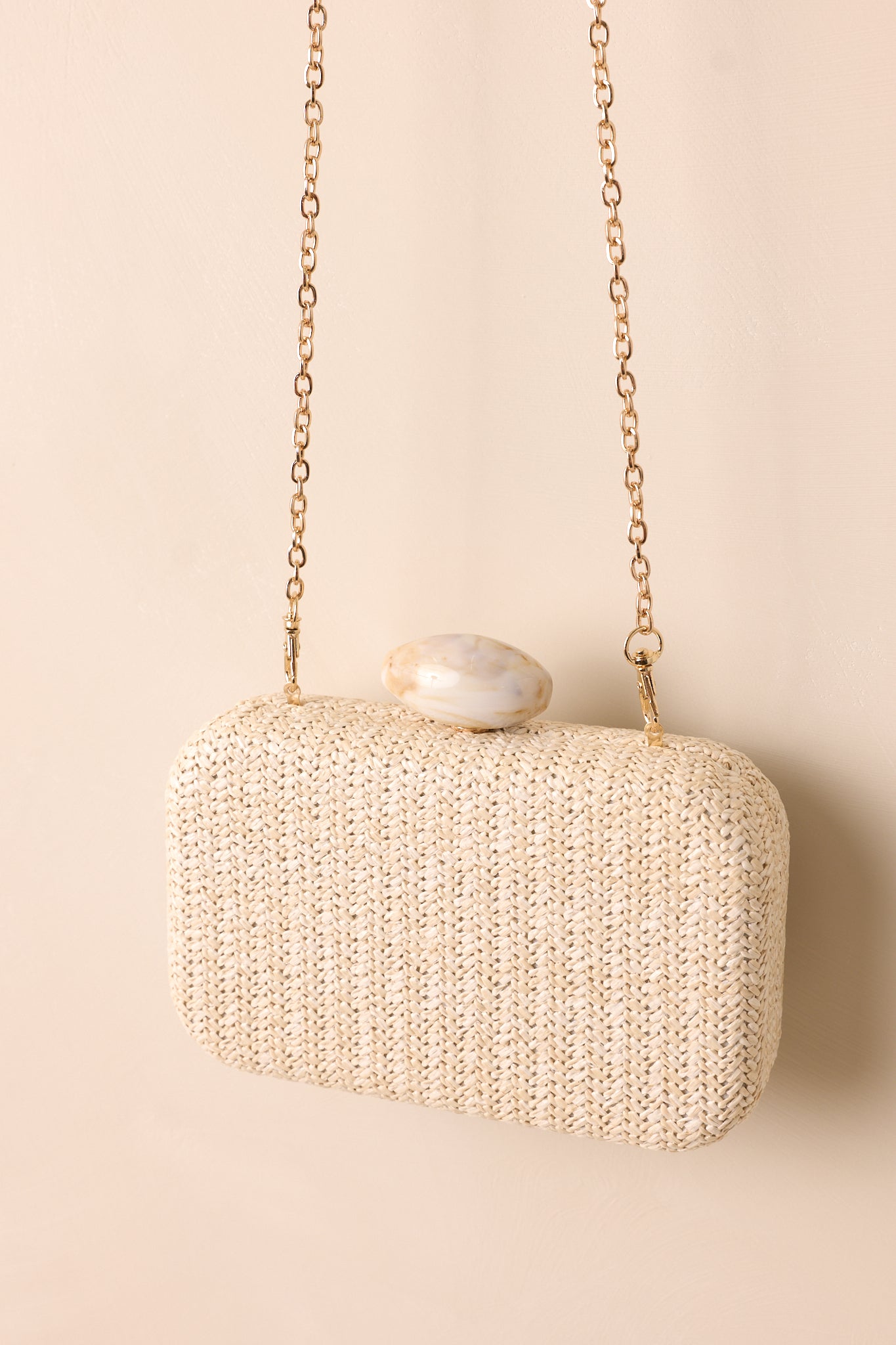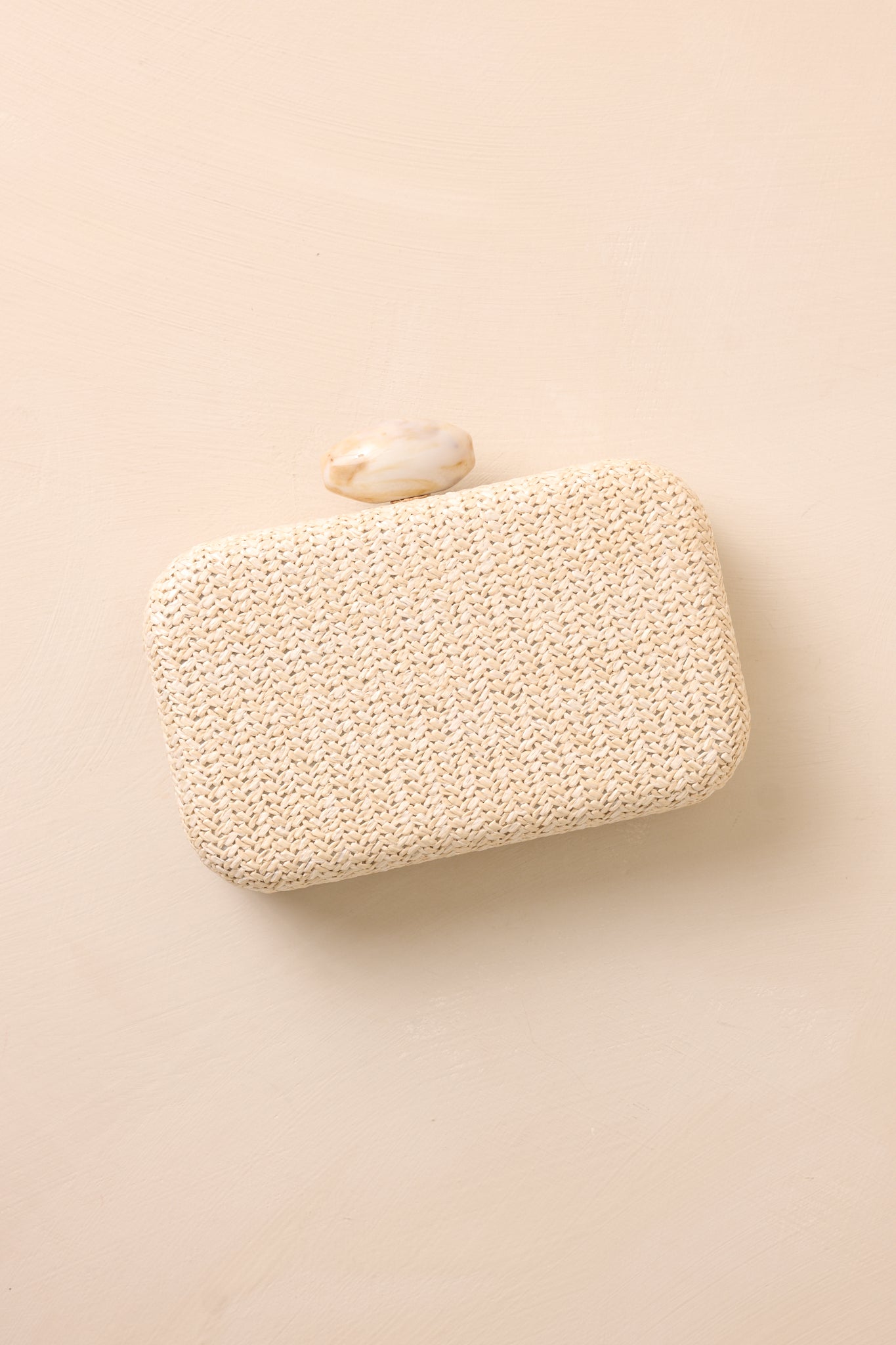 Introducing the Wuthering Moors Beige Woven Clutch - a stylish and versatile accessory that will elevate any outfit. Made with high-quality woven material, this clutch is durable and chic. With plenty of space for all your essentials, it's perfect for a night out or day trip. This beige clutch features a beige woven straw material, a rectangular shape, a large oval marbled snap closure, an optional small gold chain for handbag use and a large lined inside pouch.