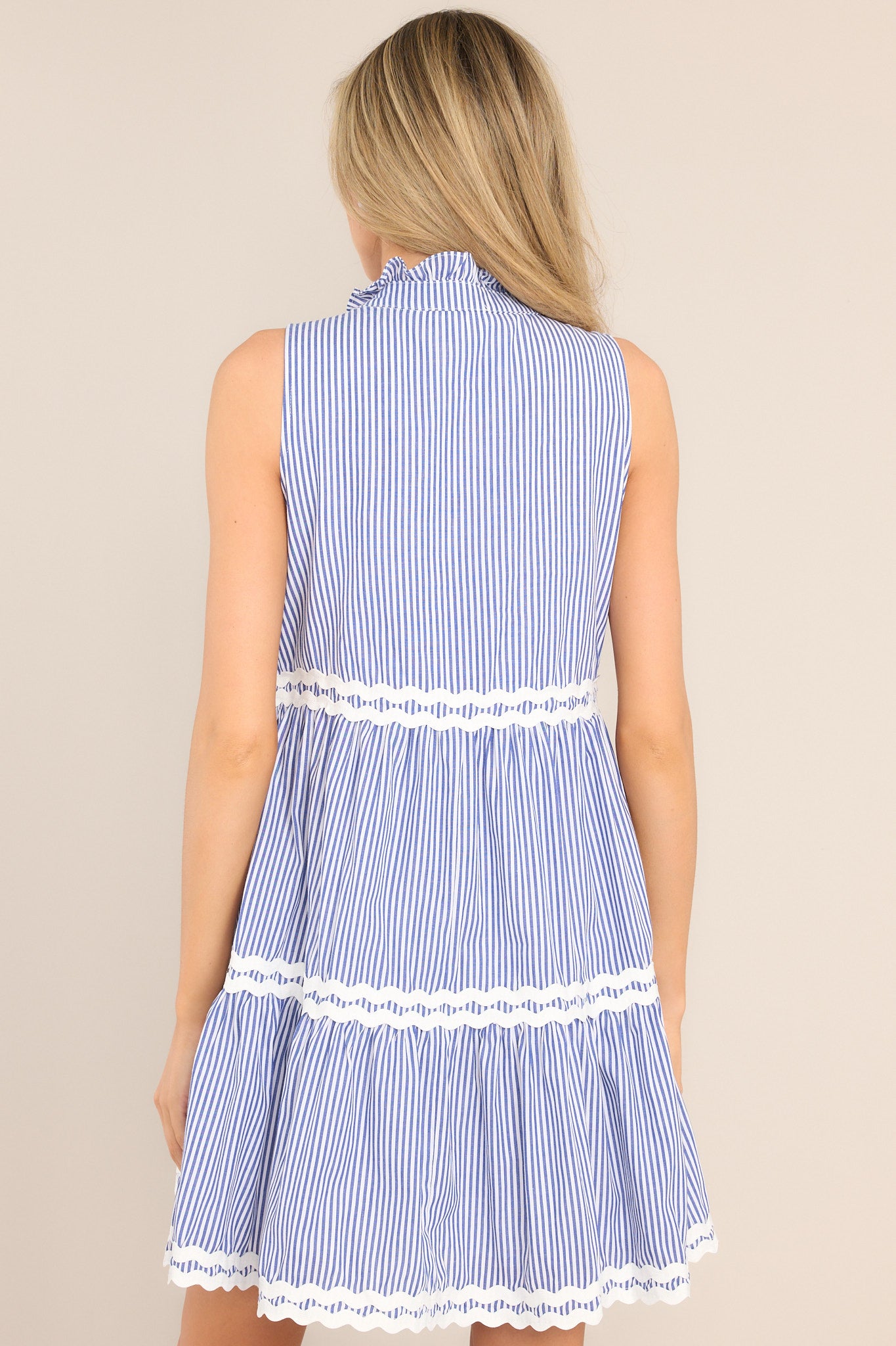 Make a statement with our Year in Review Scalloped Mini Dress! Featuring a playful blue and white design, this dress is perfect for any occasion. With its scalloped hem and mini length, you'll be sure to turn heads. Stay on trend with this must-have dress! This dress features a ruffled v-neckline, scallop detailing, functional hip pockets, and a scalloped hemline.