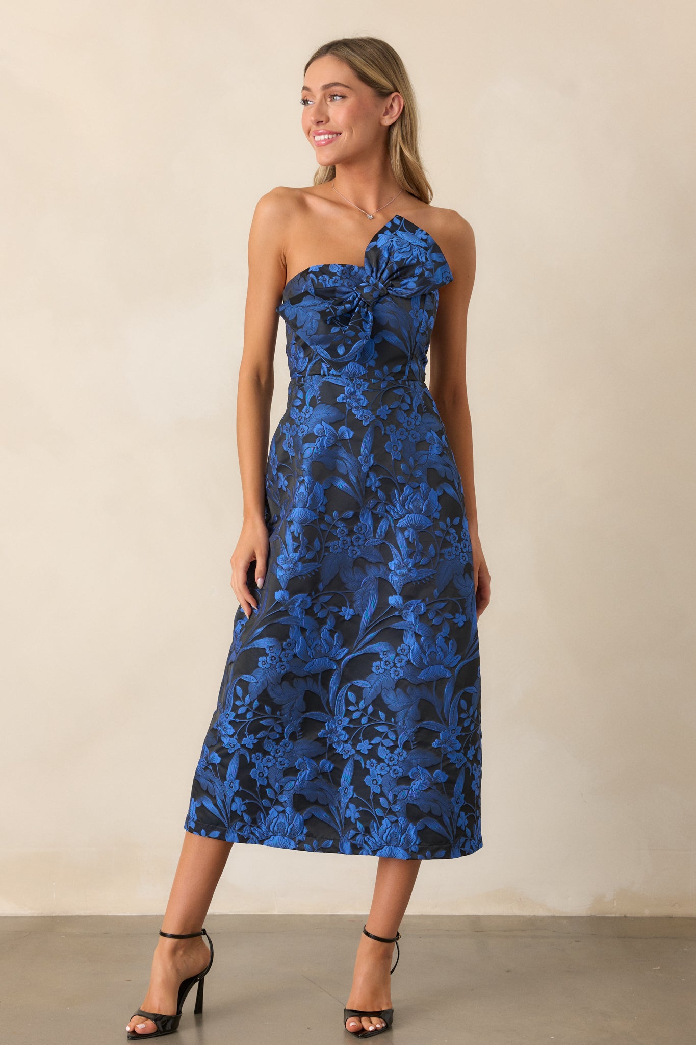 You're Electric Midnight Blue Jacquard Strapless Midi Dress