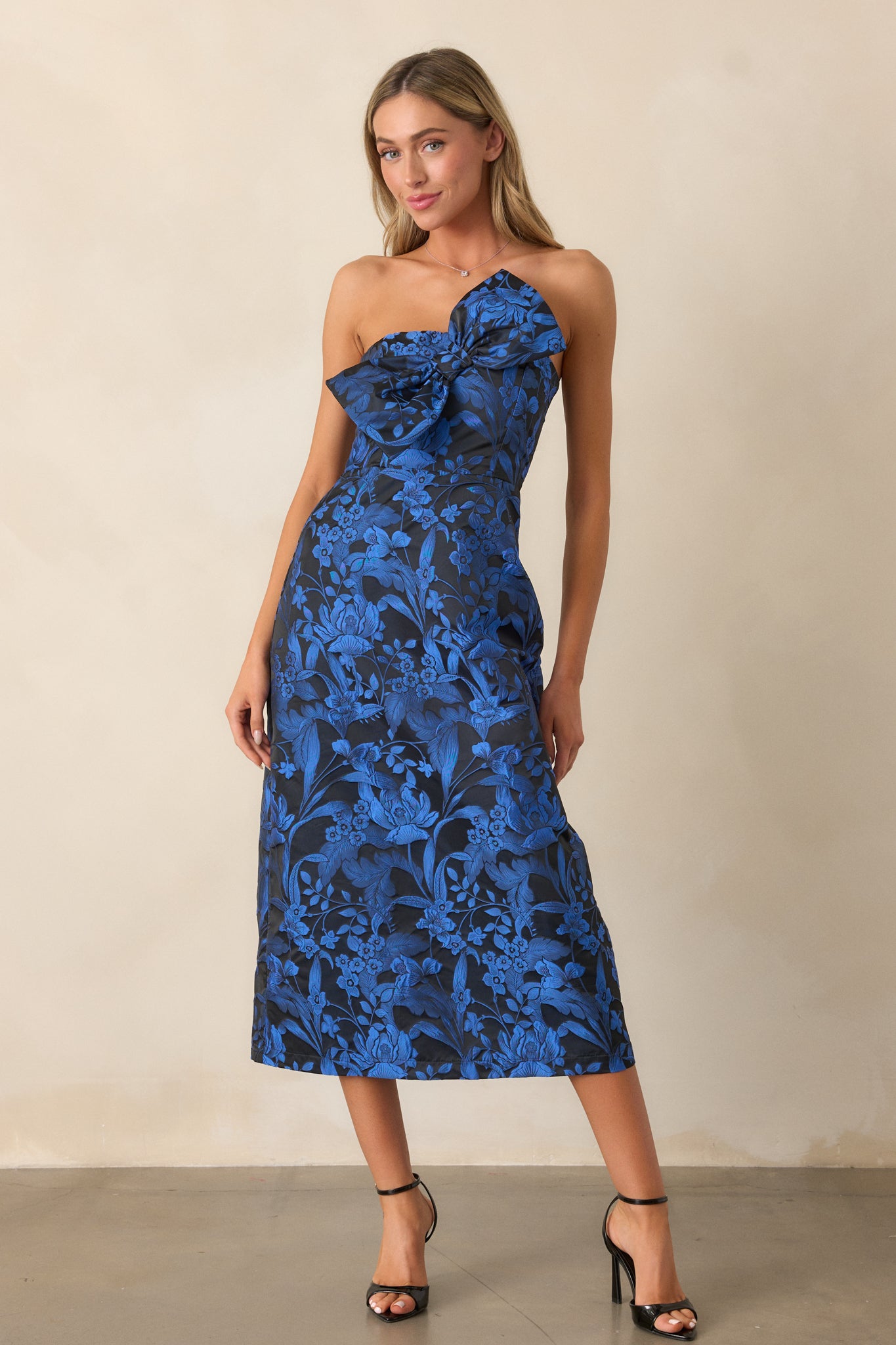 Look and feel your best with our You're Electric Midnight Blue Jacquard Strapless Midi Dress. The jacquard fabric adds a touch of glamour, while the strapless design highlights your shoulders. Perfect for any occasion, this dress is sure to make you stand out in the best way possible. This midnight blue midi dress features a strapless neckline with a large bow embellishment, a structured design, jacquard fabric, and discrete back zipper.