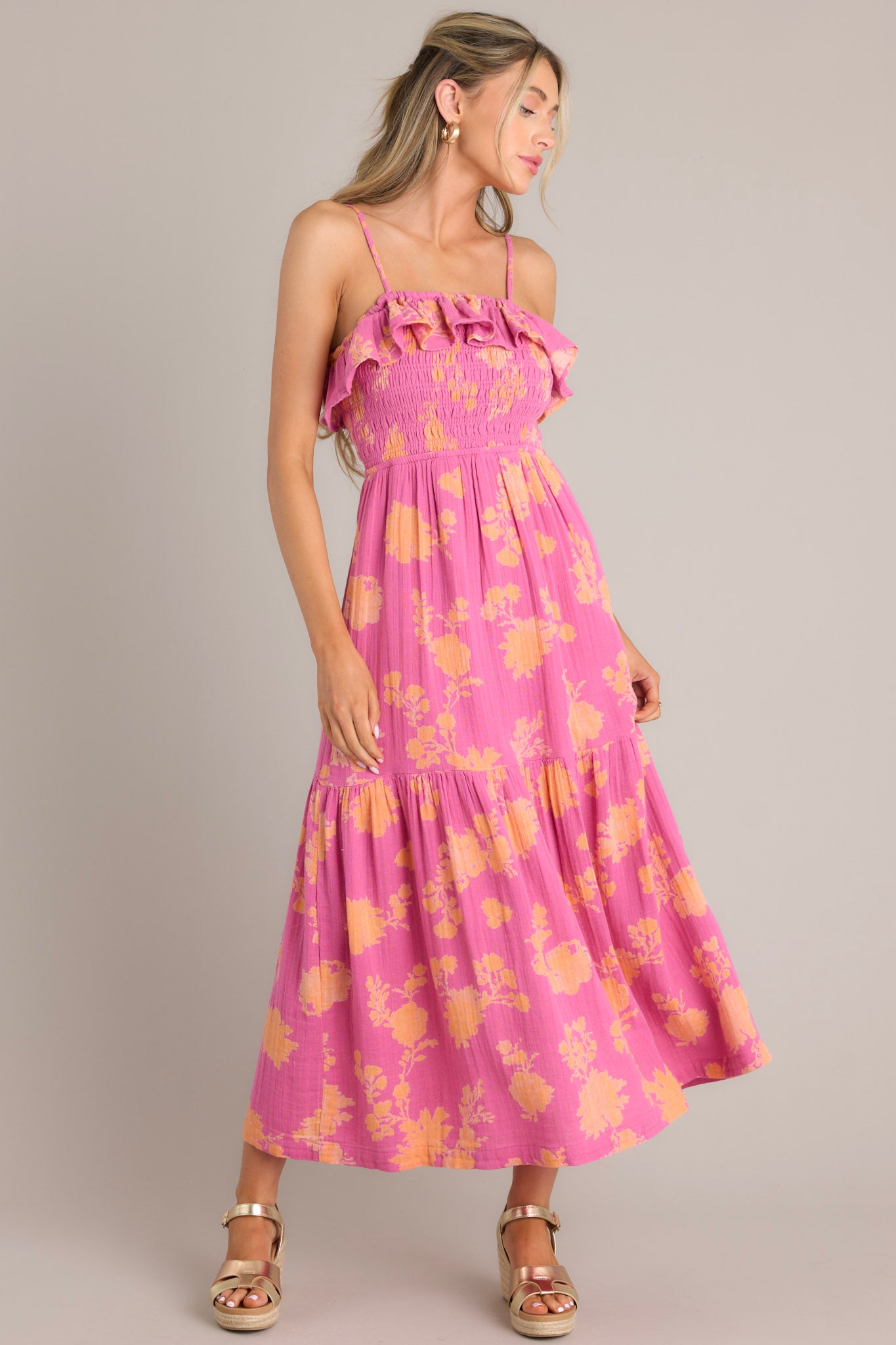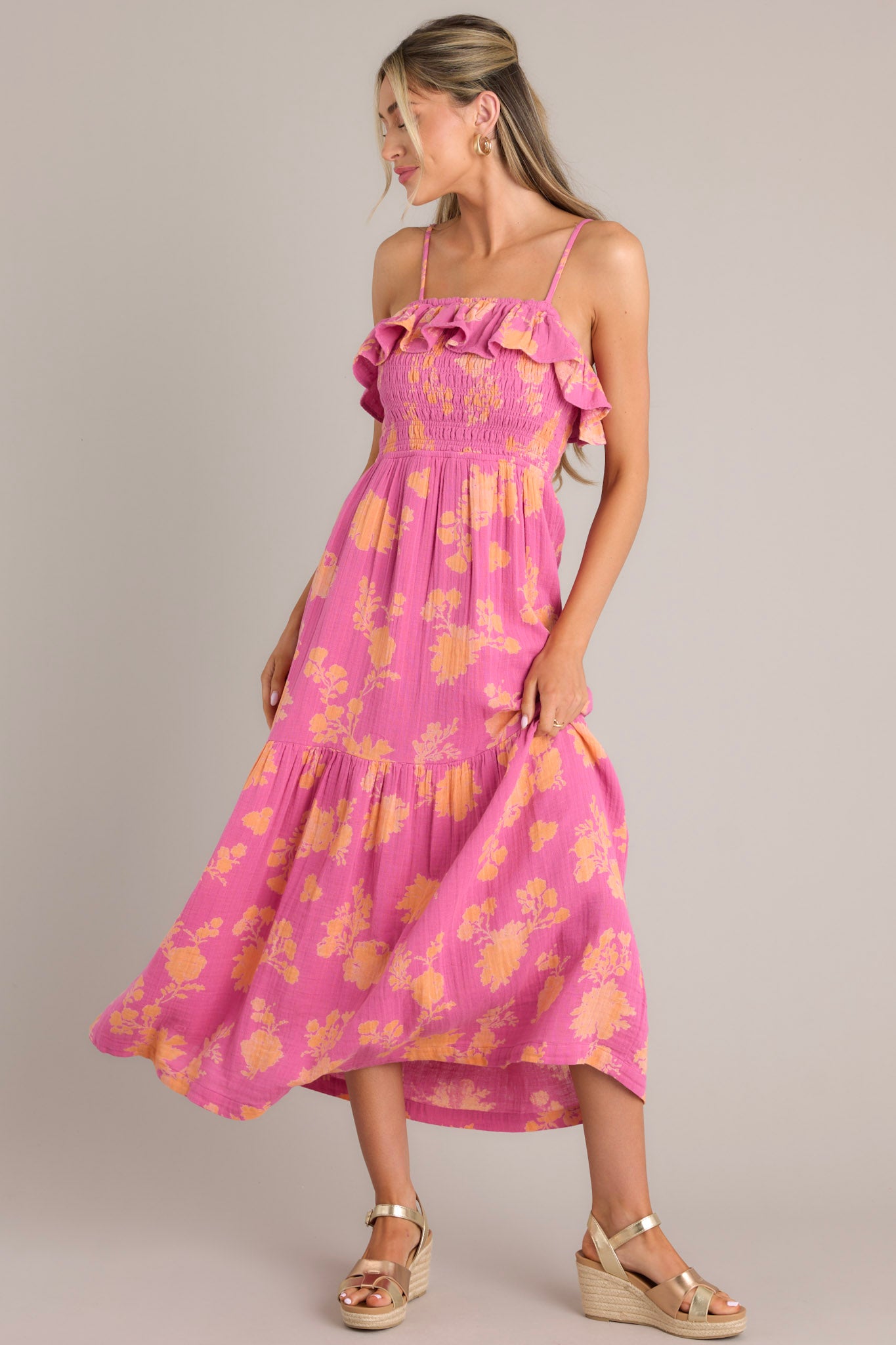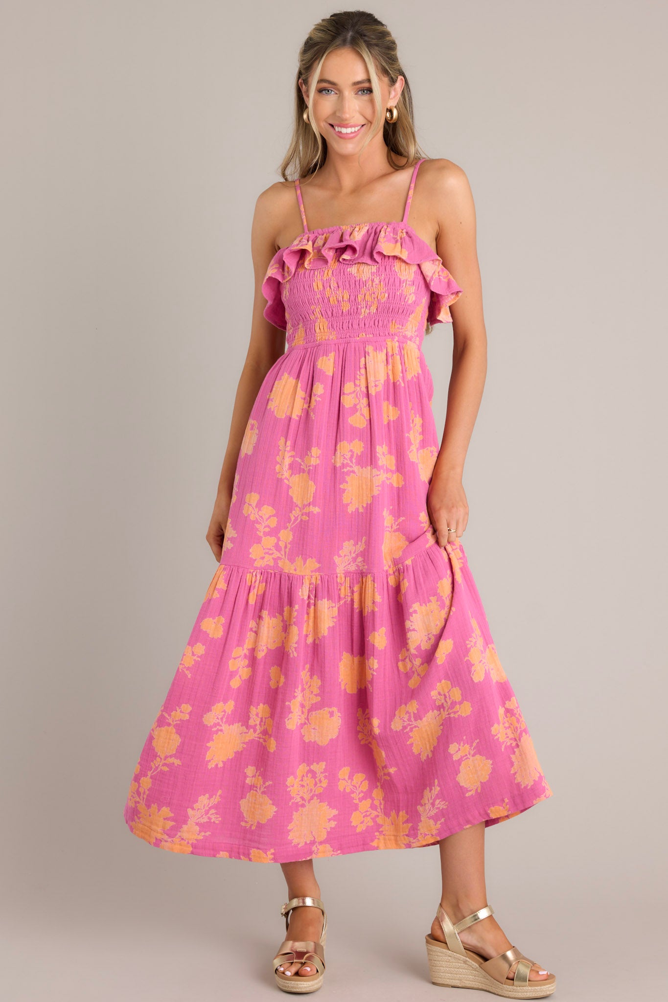 Sail away in style with our Z-Supply Bahari Sunshine Floral Pink Midi Dress! Featuring a vibrant floral print and flowy midi length, this dress is perfect for a fun day in the sun. Made with high-quality material for comfort and durability. Get your summer wardrobe ready with this must-have dress! This floral midi dress features a ruffled square neckline, thin adjustable straps, a fully smocked bodice, a tiered design, and a flowing silhouette.