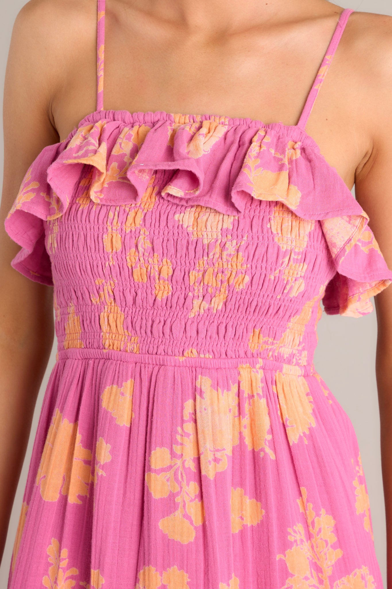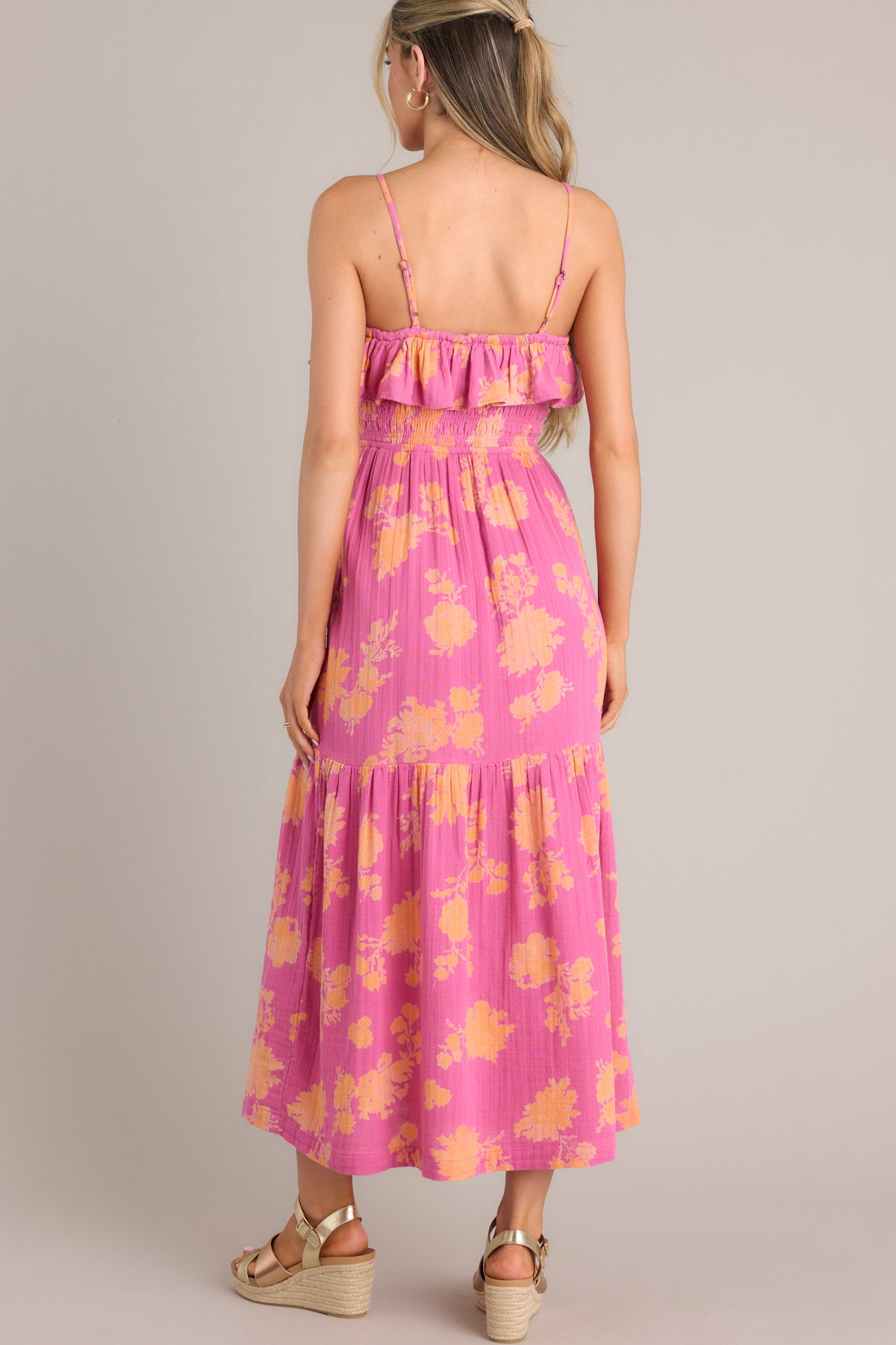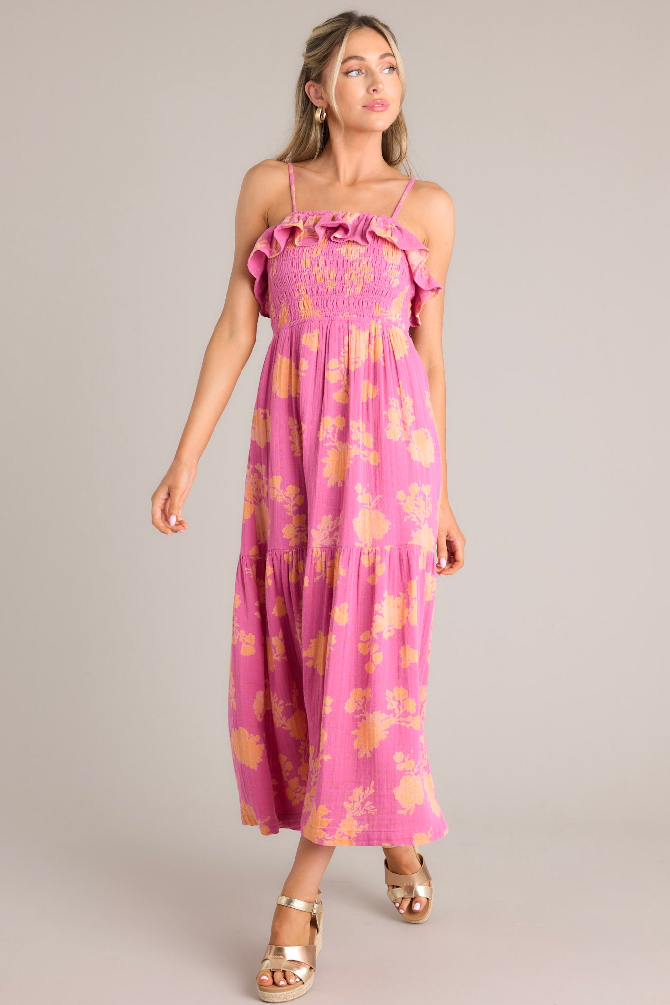 Sail away in style with our Z-Supply Bahari Sunshine Floral Pink Midi Dress! Featuring a vibrant floral print and flowy midi length, this dress is perfect for a fun day in the sun. Made with high-quality material for comfort and durability. Get your summer wardrobe ready with this must-have dress! This floral midi dress features a ruffled square neckline, thin adjustable straps, a fully smocked bodice, a tiered design, and a flowing silhouette.