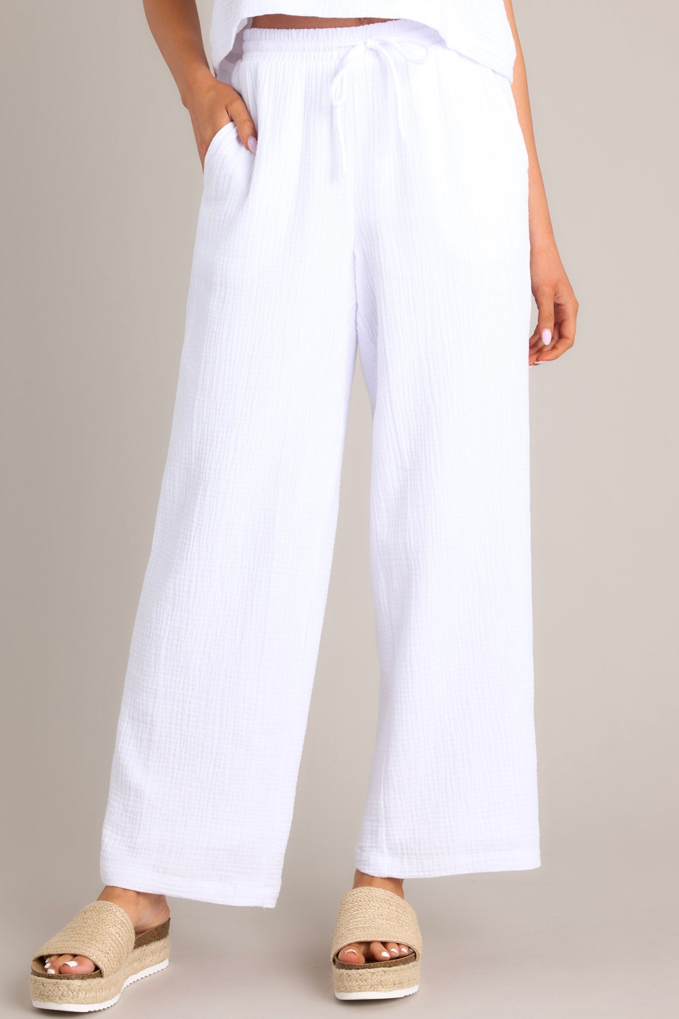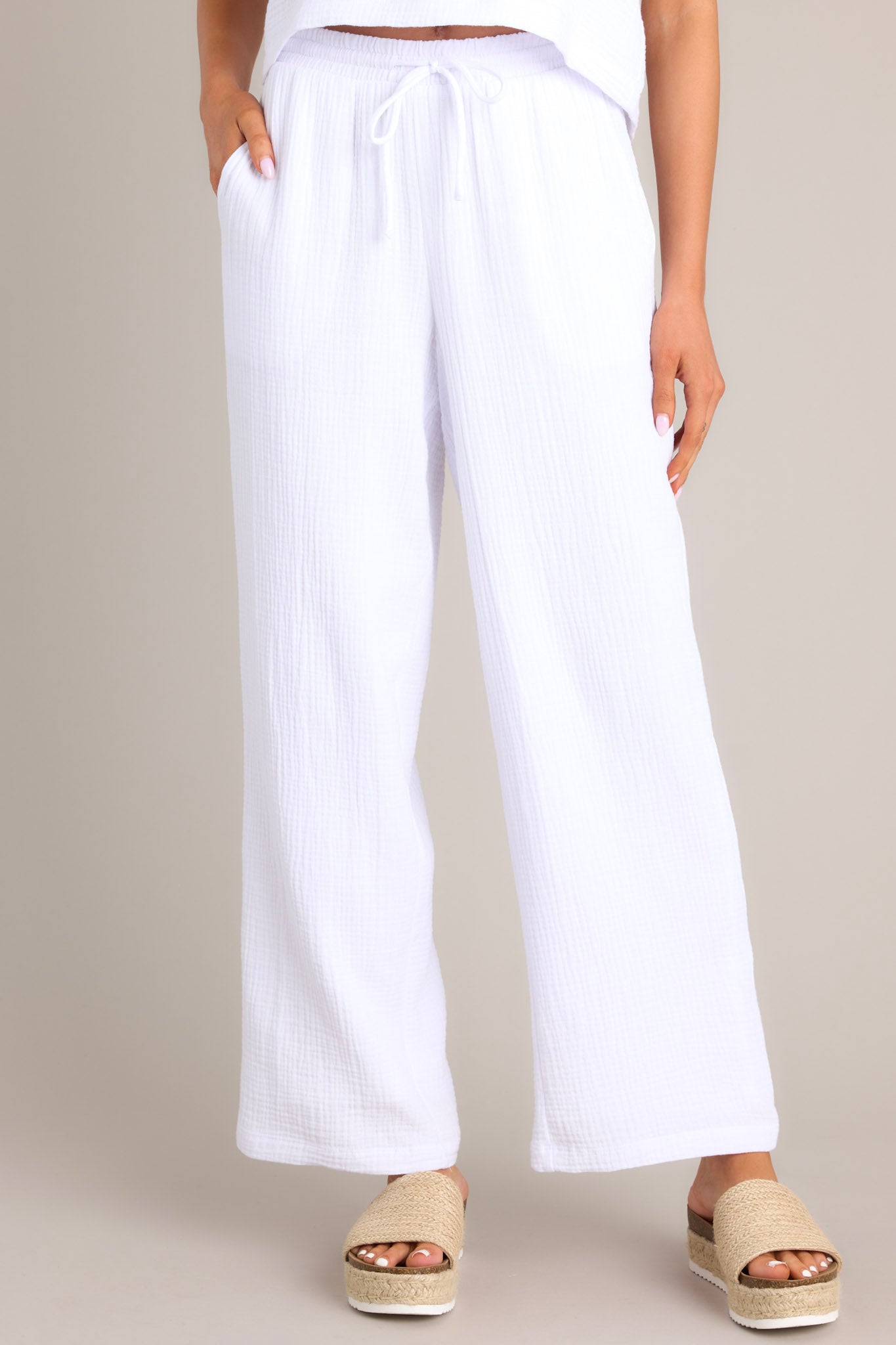 Introducing our Z-Supply Bondi White Gauze Pants! These airy, lightweight pants are perfect for any summer day or beach trip. You'll feel breezy and chic, with a touch of laid-back attitude. Slip them on and transform into a stylish beach babe! These pants feature a high waisted design, an elastic waistband, a self-tie drawstring, functional hip pockets, and a wide leg.