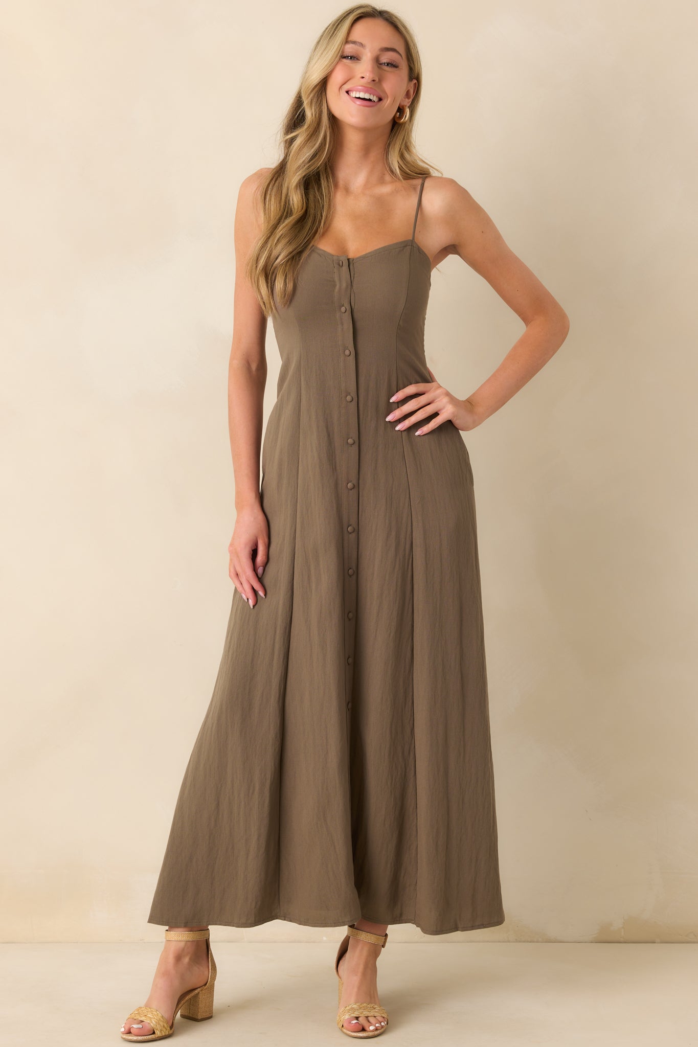 The Z Supply Brown Angel Eyes Airy Midi Dress is that effortlessly cool piece you’ll want on repeat. Light, flowy, and full of understated charm. It’s perfect for those in-between days when you want to feel put-together with zero effort. This tiki brown midi dress features a functional button front, sweetheart neckline, adjustable spaghetti straps, back side smocked panels, full lining, and functional pockets.