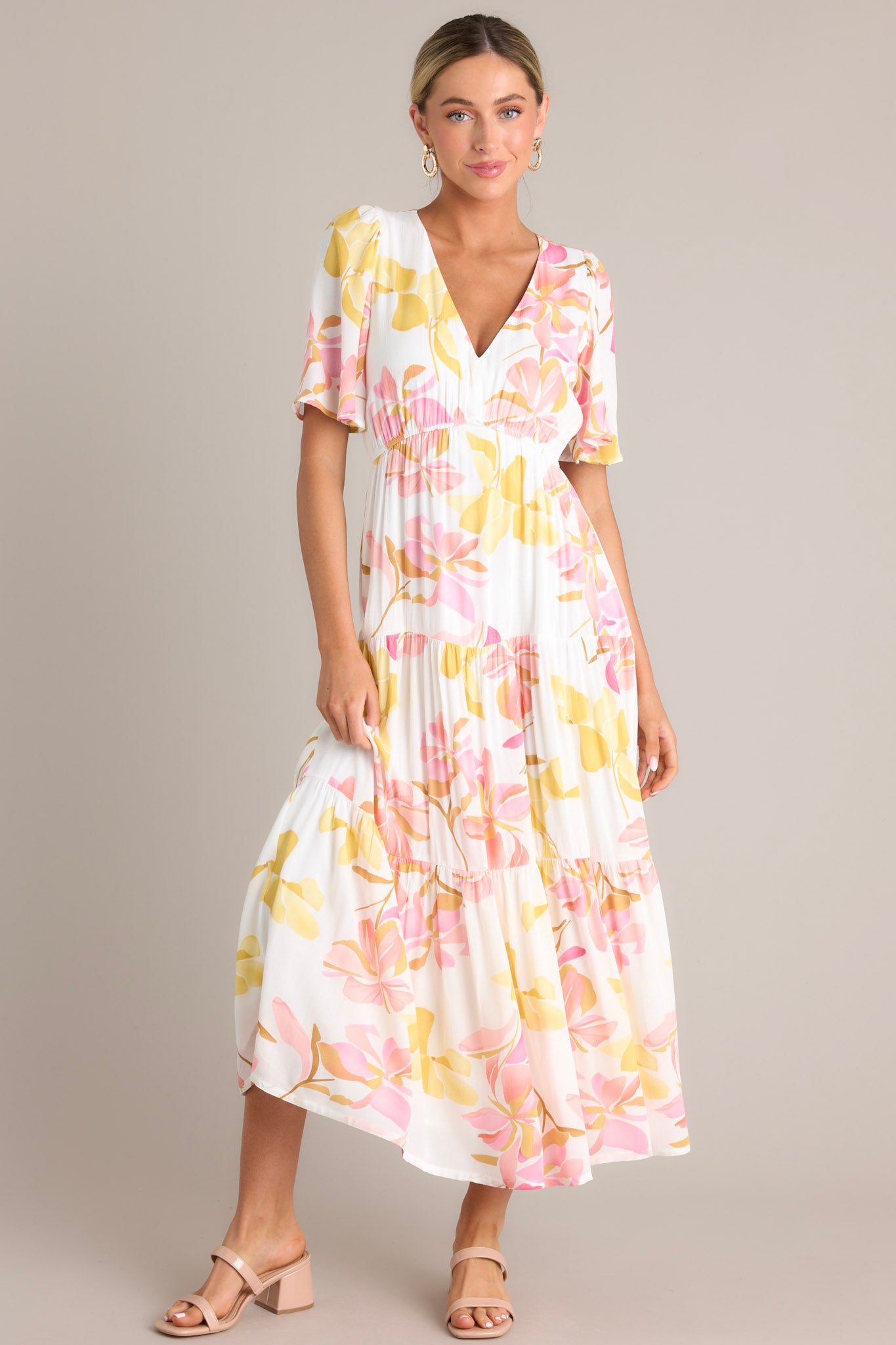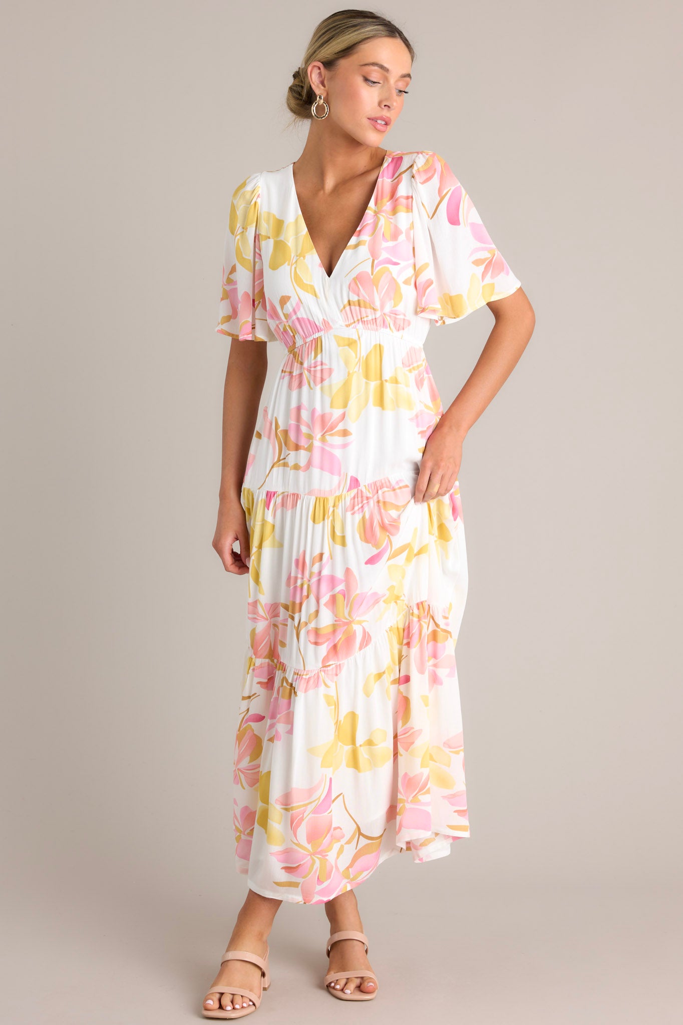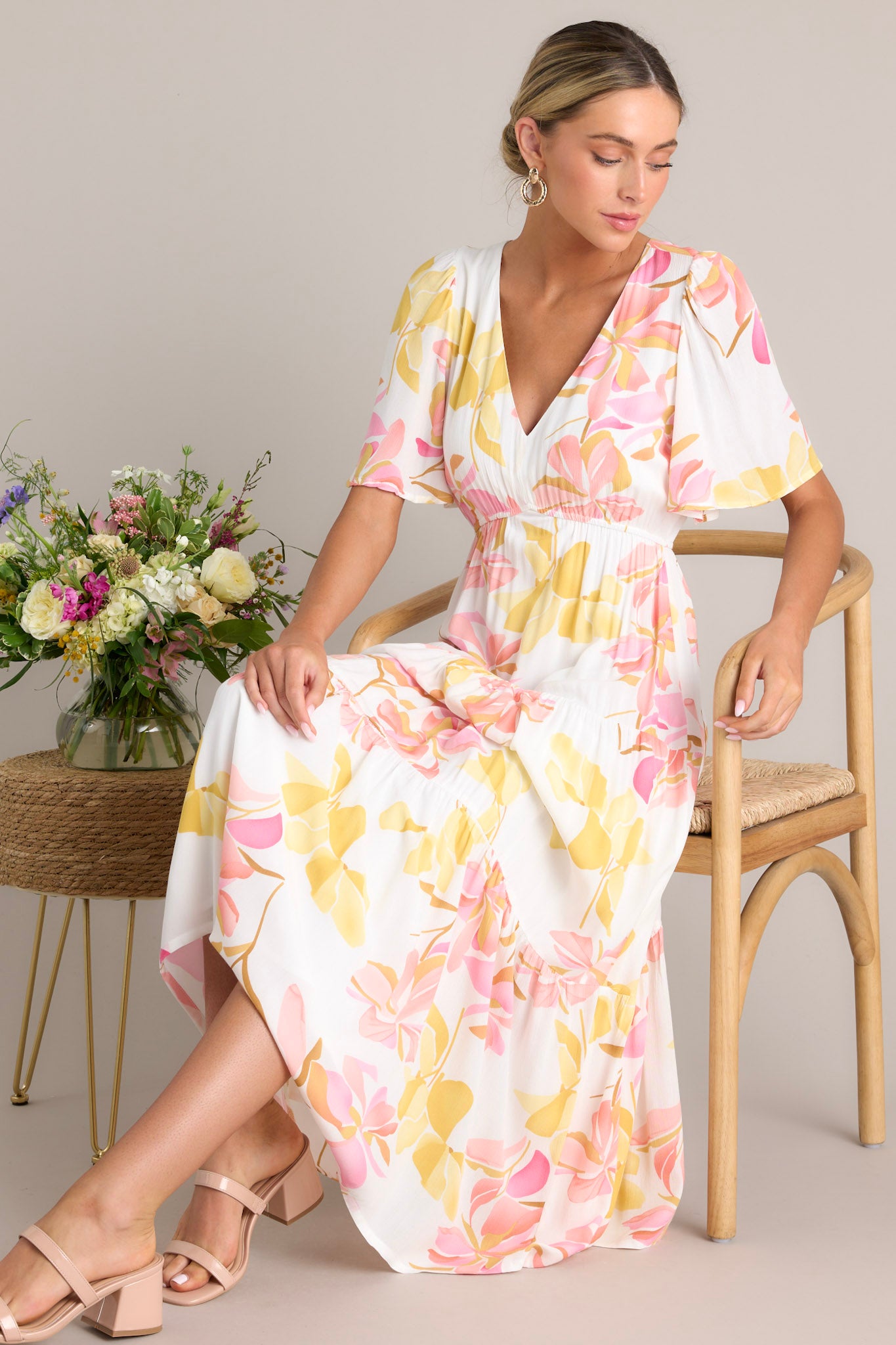 Unleash your inner flower child with the Z-Supply Kat Golden Hour Sandstone Floral Maxi Dress. This flowy, bohemian dress is perfect for sunny days and music festivals. With its floral print and comfortable fit, you'll be the epitome of carefree, cool style. This floral maxi dress features a v-neckline, an elastic waistband, a tiered design, and short flutter sleeves.
