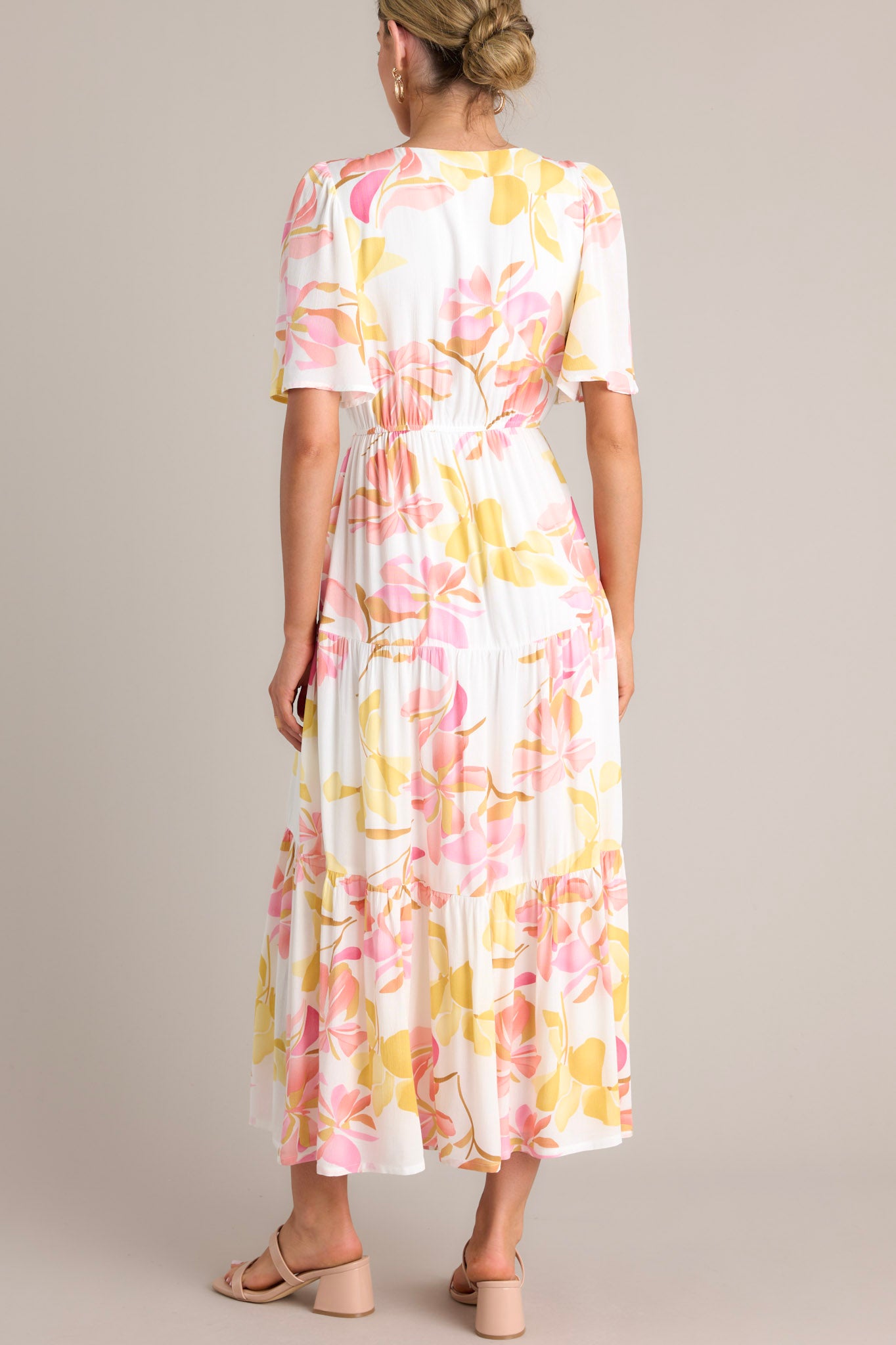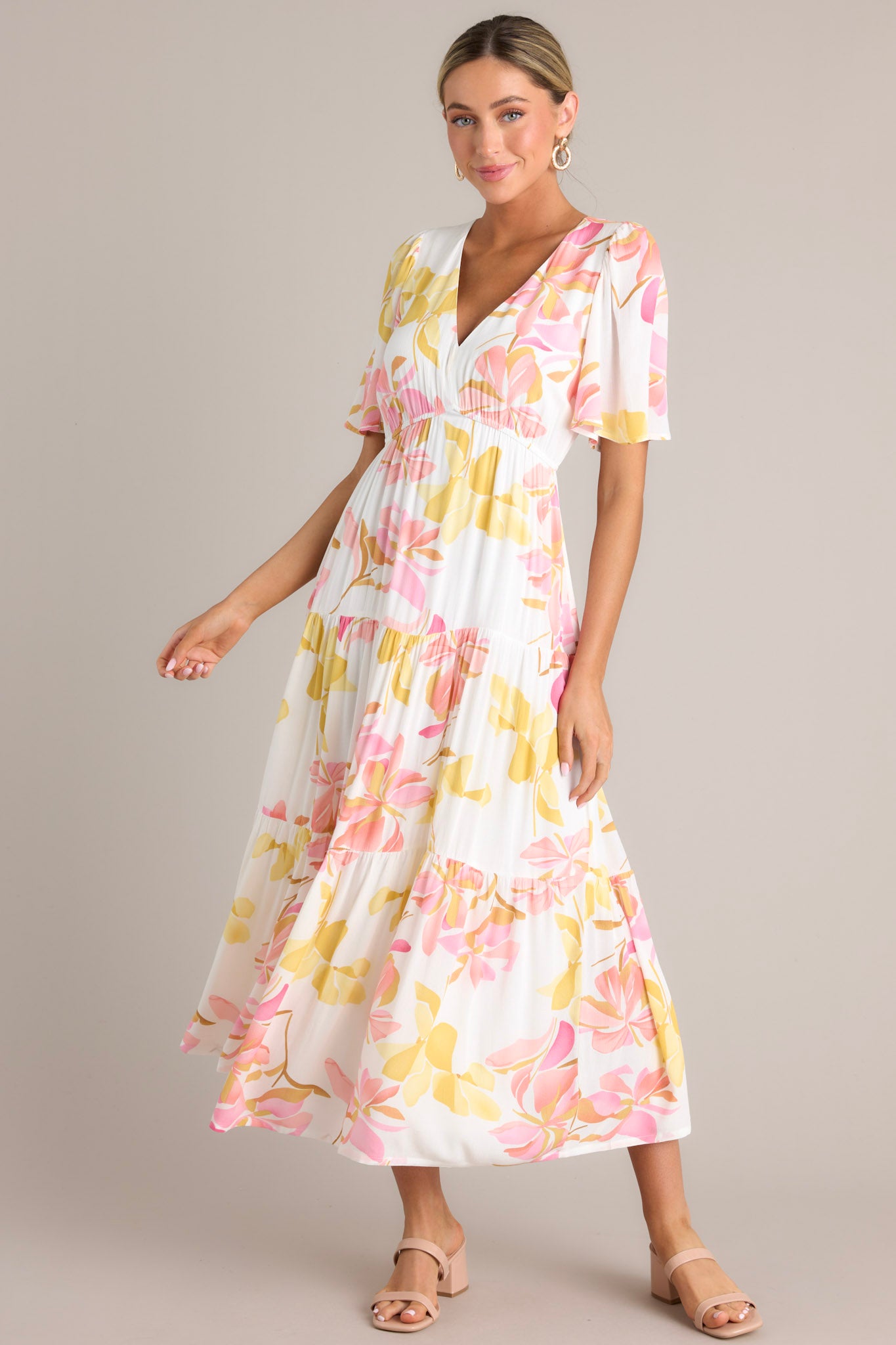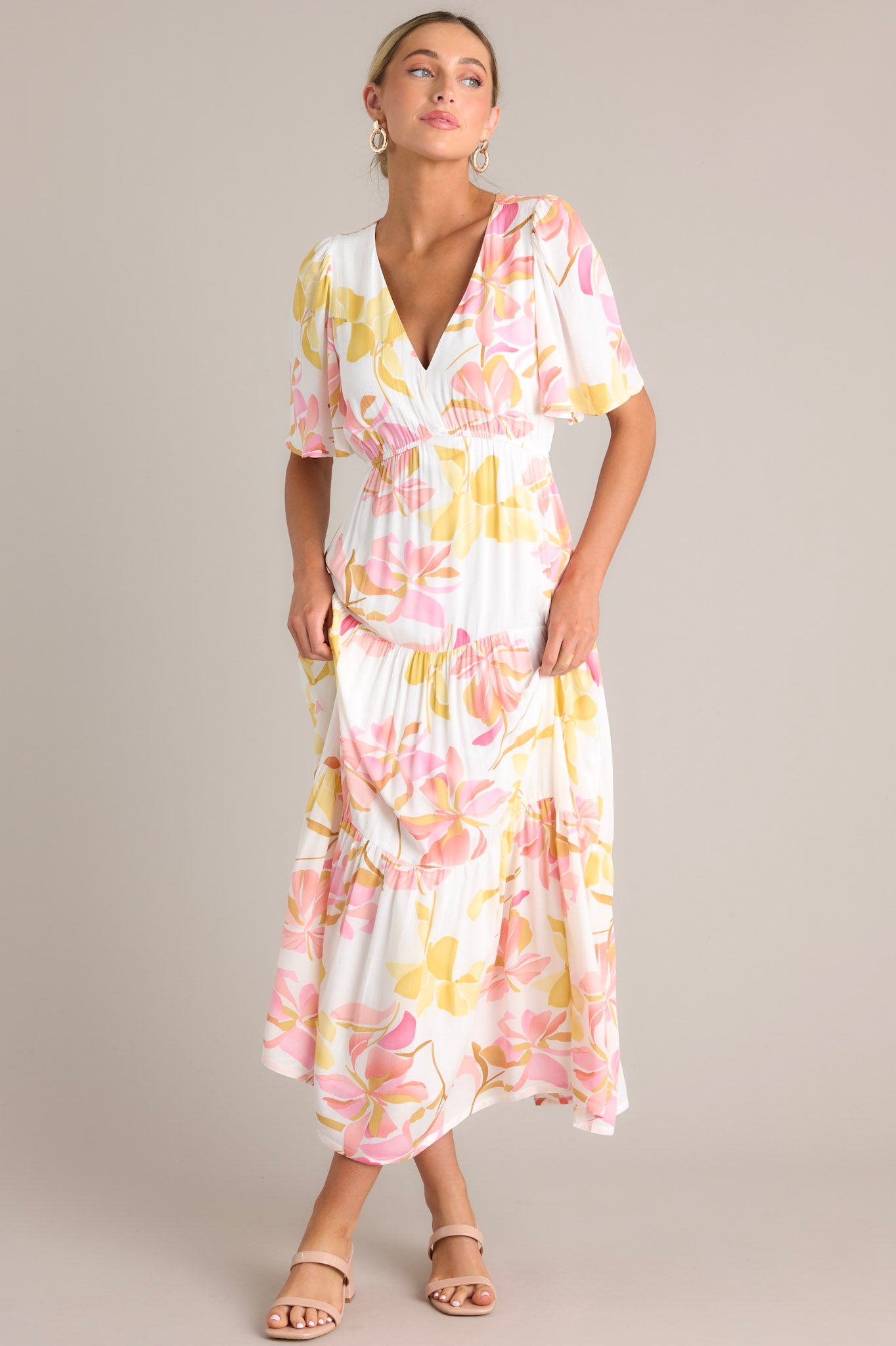 Unleash your inner flower child with the Z-Supply Kat Golden Hour Sandstone Floral Maxi Dress. This flowy, bohemian dress is perfect for sunny days and music festivals. With its floral print and comfortable fit, you'll be the epitome of carefree, cool style. This floral maxi dress features a v-neckline, an elastic waistband, a tiered design, and short flutter sleeves.