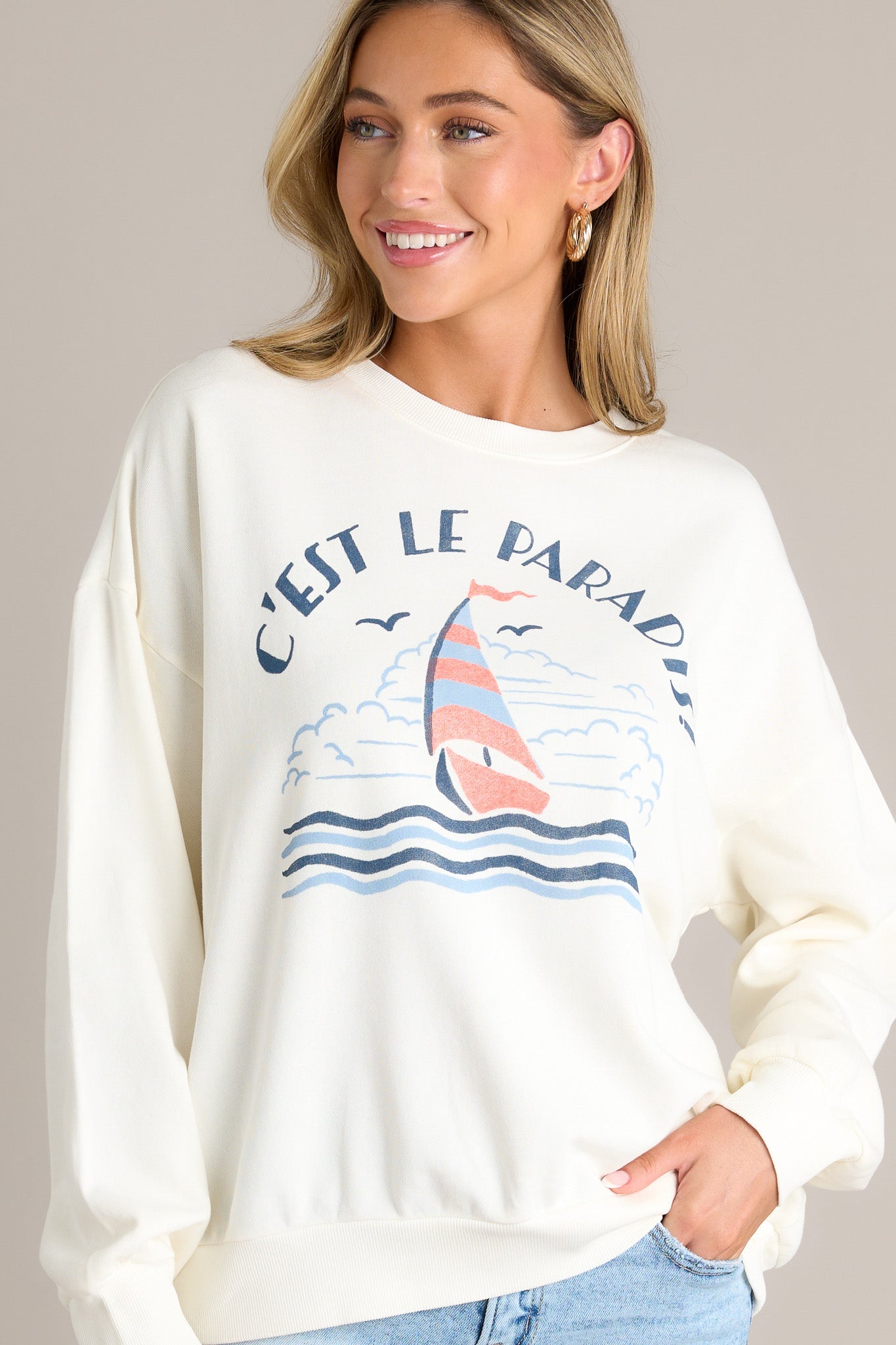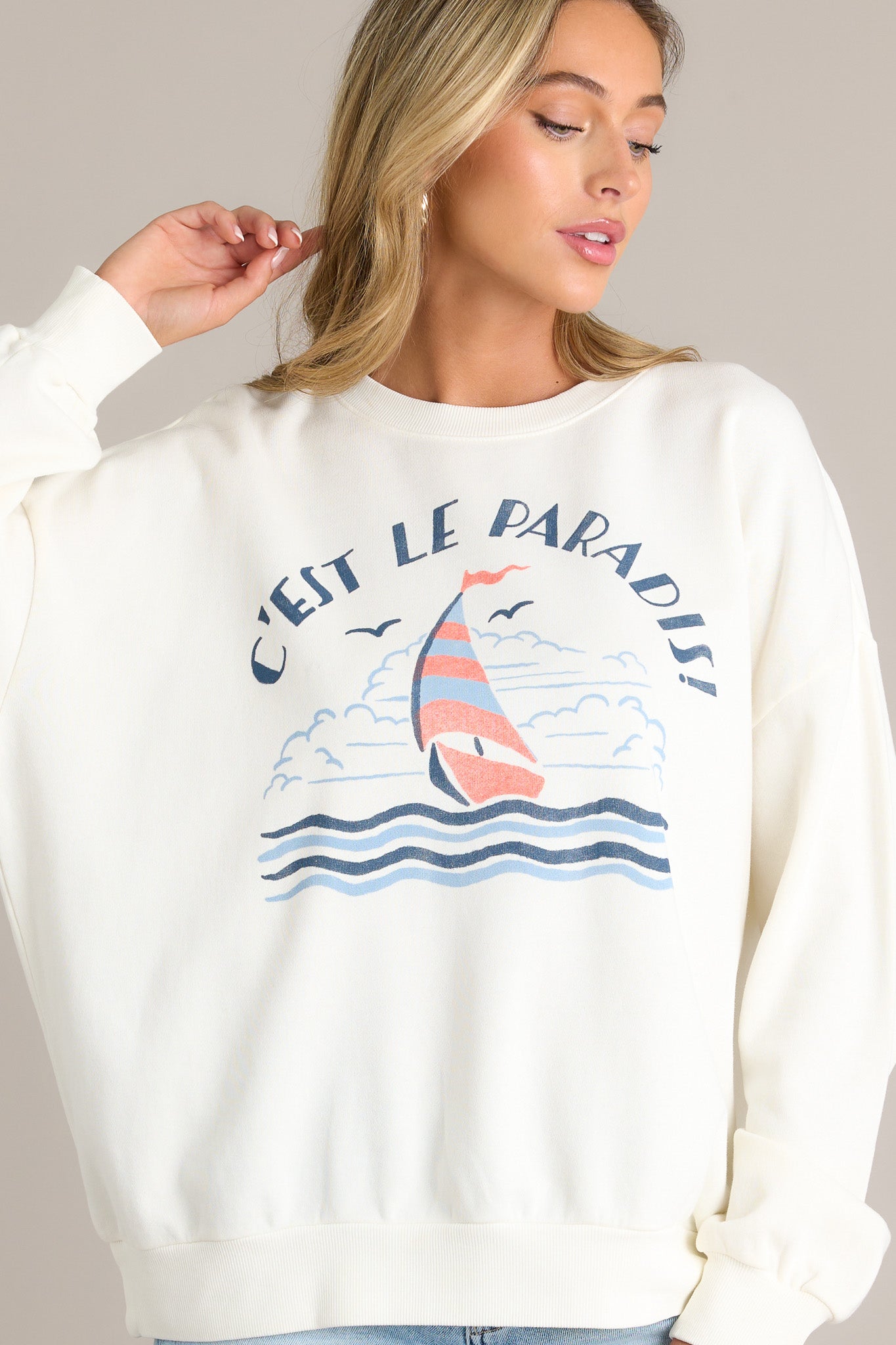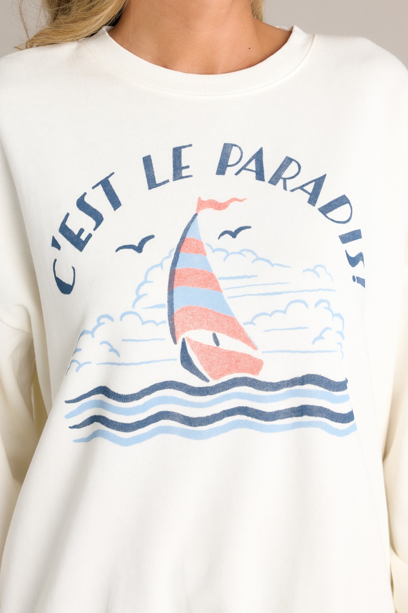 Unleash your inner beach babe with the Z Supply Le Paradis Sunday Sea Salt Sweatshirt! Made with soft and cozy fabric, this sweatshirt will keep you comfortable and stylish all day long. With its unique sea salt color and relaxed fit, you'll be the envy of everyone at the beach. This white sweatshirt features a crew neckline, a sailboat themed graphic, ribbed cuffed long sleeves, and a ribbed hemline.
