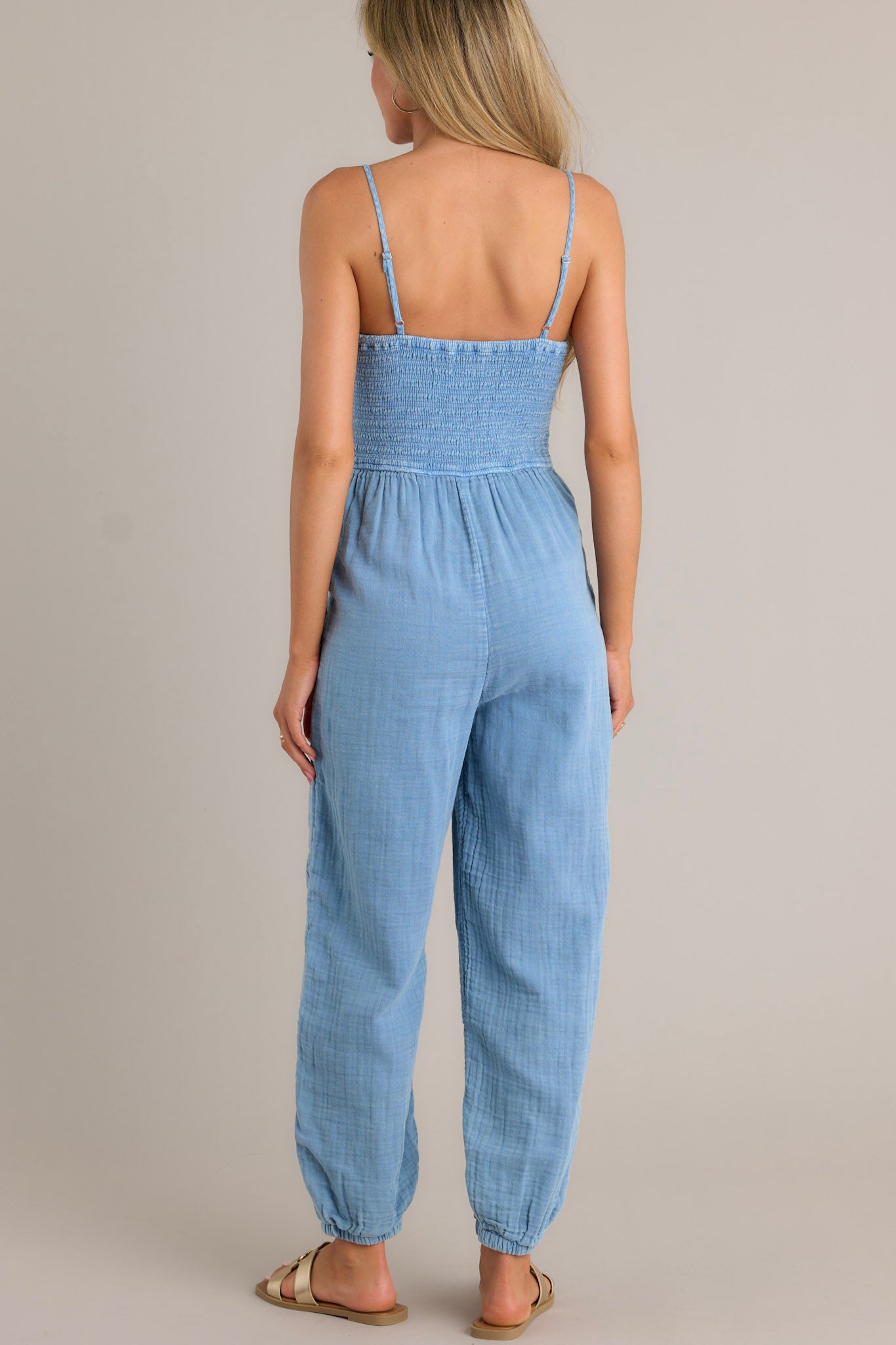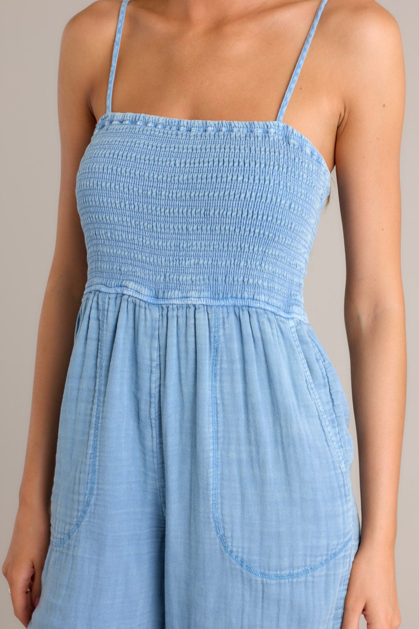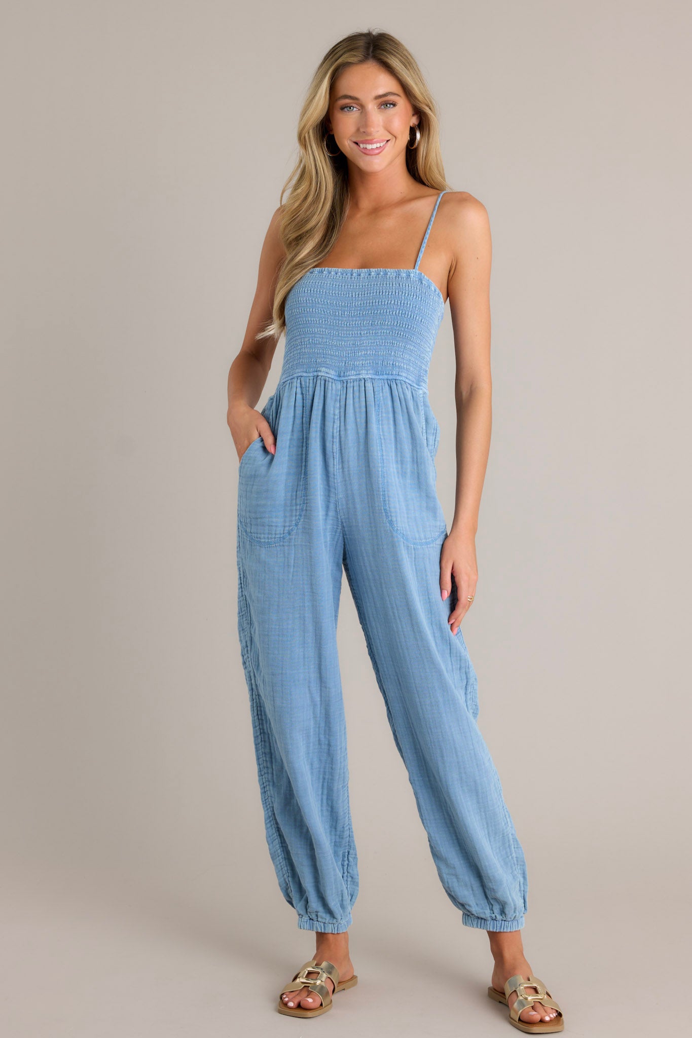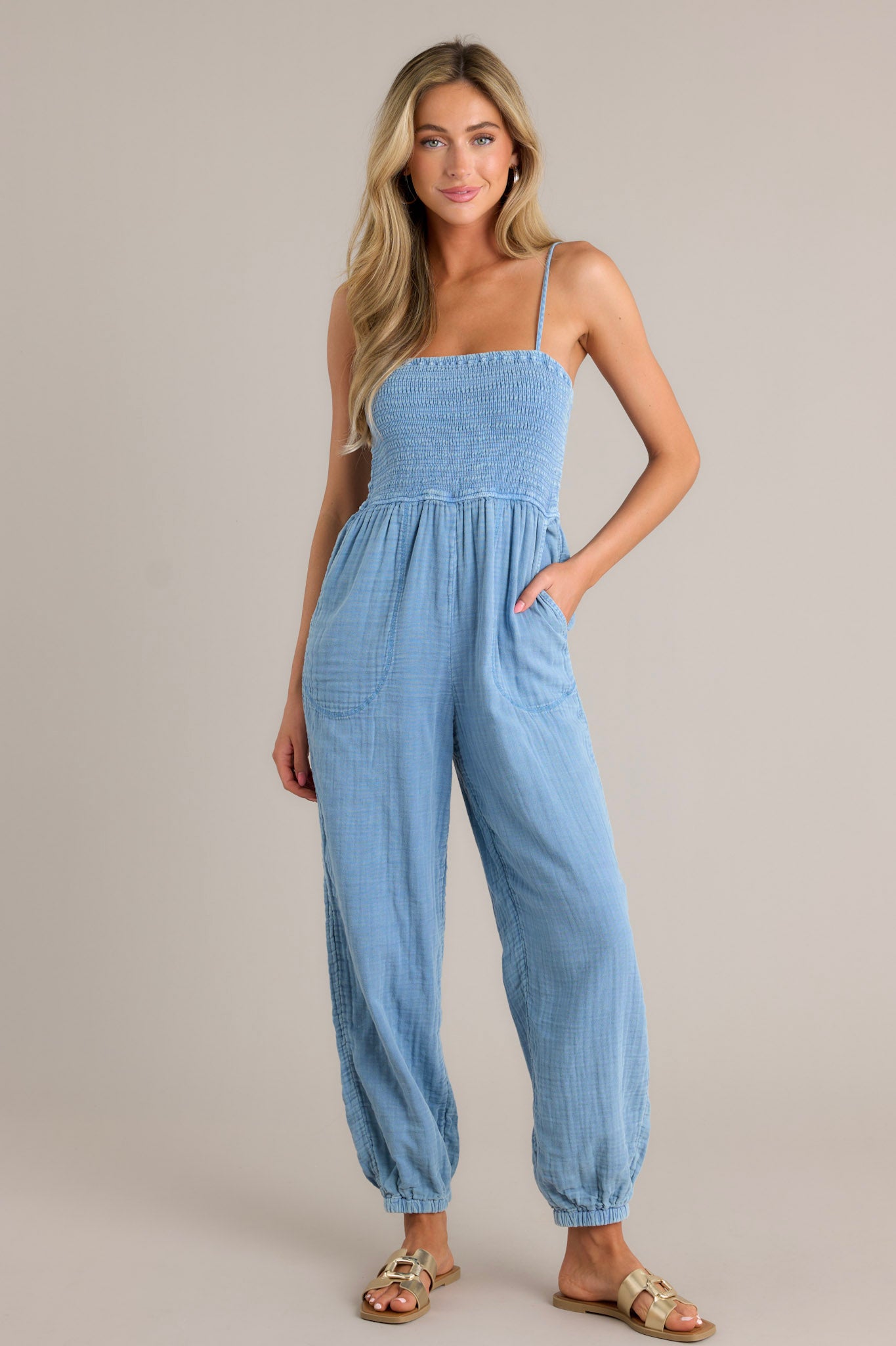 Introducing the Z Supply Santos Deep Indigo Gauze Jumpsuit - the ultimate combination of comfort and style. Made with lightweight and breathable fabric, this jumpsuit is perfect for any occasion. Dress it up or down, it's versatile enough for all your adventures. Upgrade your wardrobe and embrace effortless chic! This indigo jumpsuit features a square neckline, thin adjustable straps, a fully smocked bodice, functional hip pockets, a wide leg design, and elastic cuffed ankles.