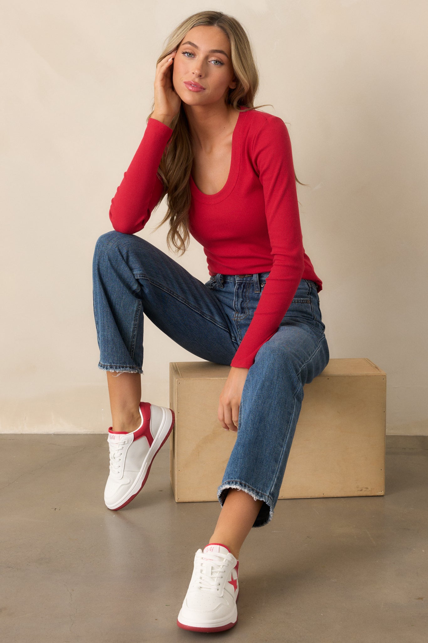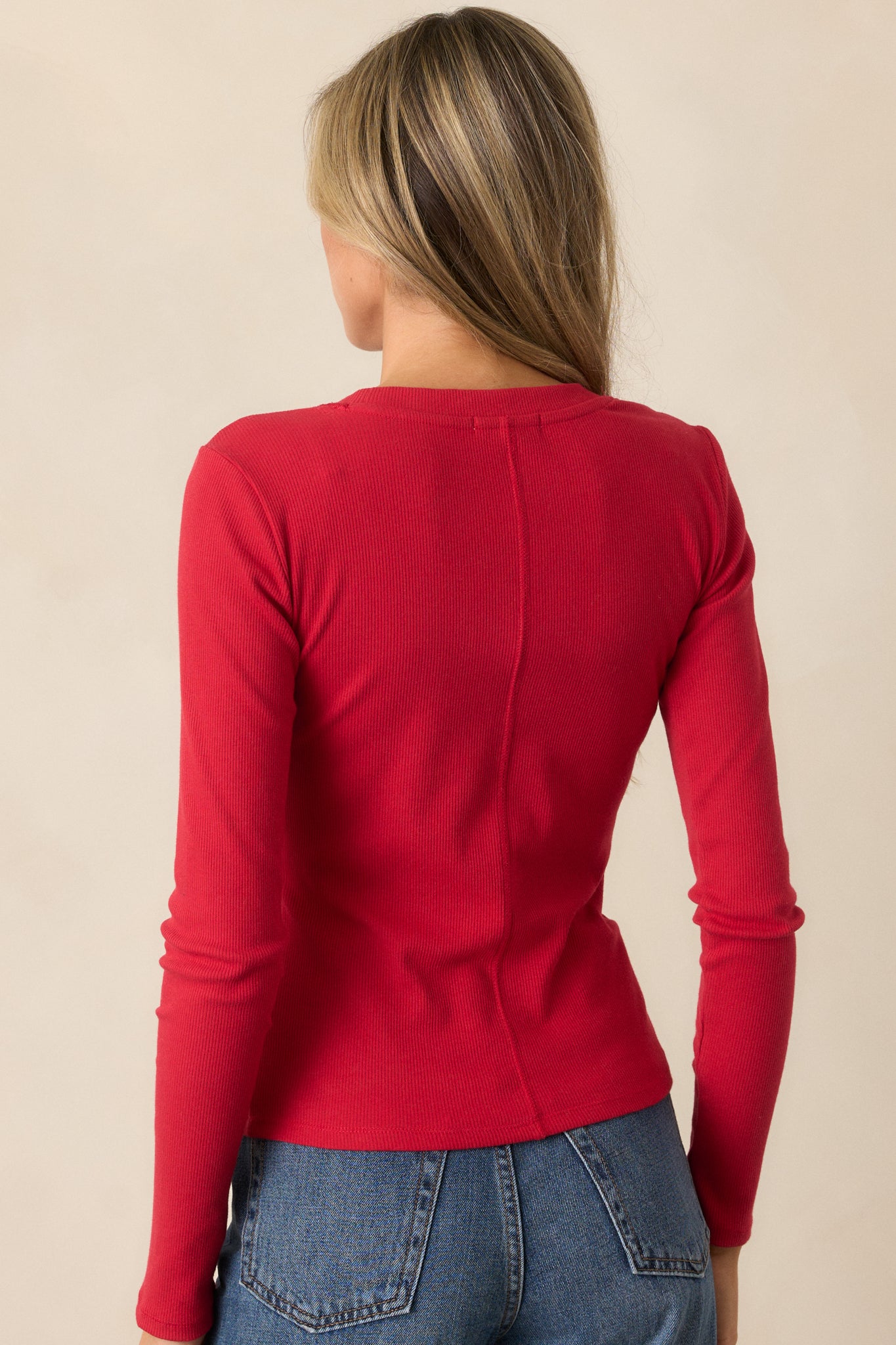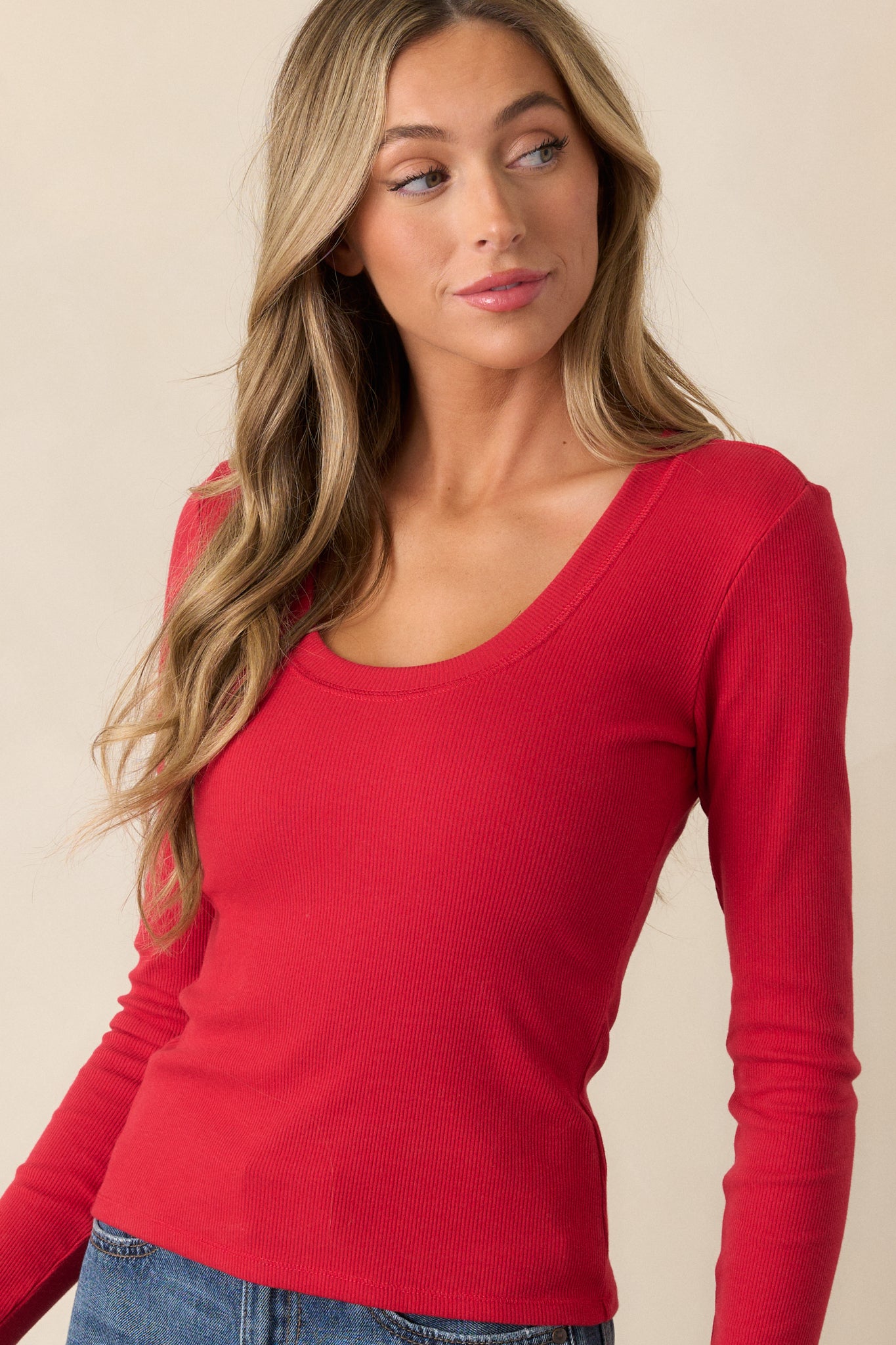 Get ready for a splash of style with Z Supply's Sirena Rib Red Long Sleeve Top. Made for the fashion-forward, this top features a unique ribbed texture and a bold pop of color that will turn heads. Perfect for any occasion, you'll feel confident and trendy in this fun and playful top. This red top features a scoop neckline, ribbed detailing, and long sleeves.