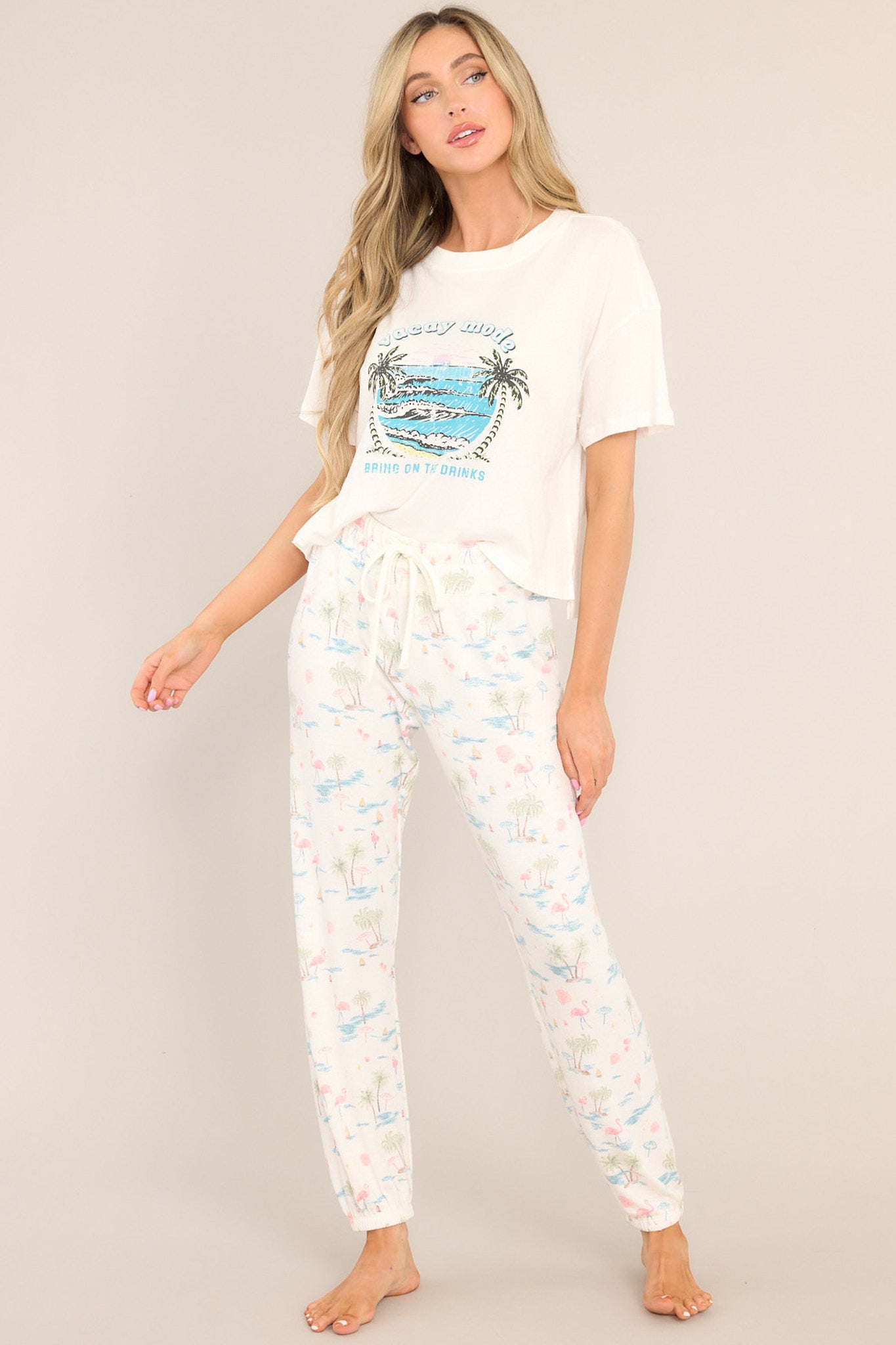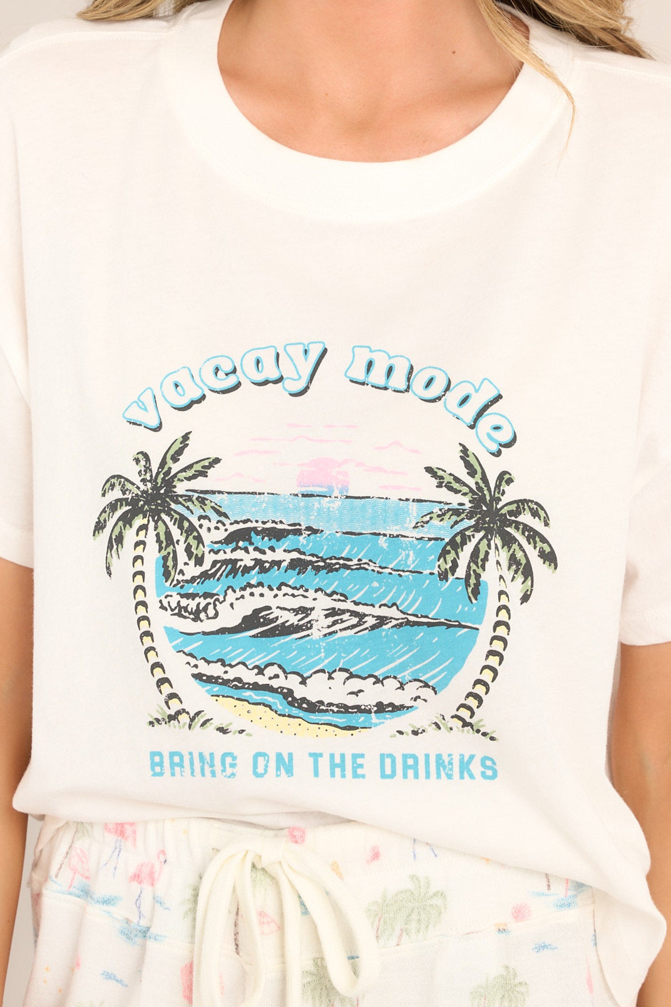 Get in vacation mode with the Z-Supply Vacay Mode Cloud Dancer Tee. Made with a lightweight, cloud-like fabric, this tee will keep you cool and comfortable all day long. Perfect for lounging or exploring, embrace the vacation vibes with this playful and quirky tee. This tee features a crew neckline, dropped shoulders, a tropical graphic, a slightly cropped length, a split hemline, and short sleeves.